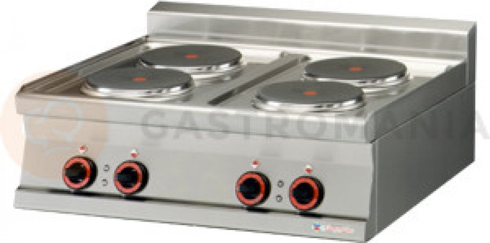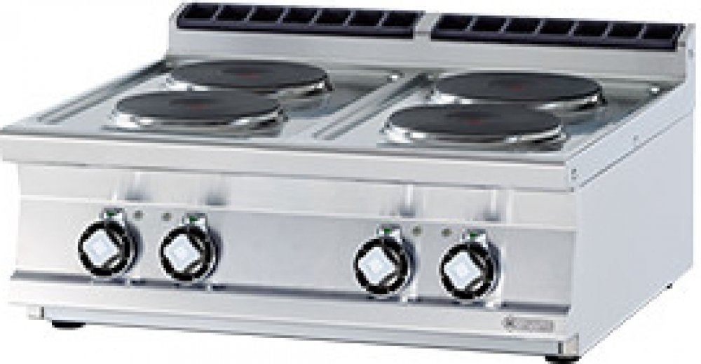 Elektrický sporák PCT 78 ET, třífázový, v celonerezovém provedení, 4 x kulatá plotýnka 2,6 kW. Varná jednotka pro použití na stole nebo na podestavbě. Zařízení má 7 teplotních stupňů a termostatickou ochranu proti přehřátí. Horní lisovaná deska zajišťuje snadnou údržbu.