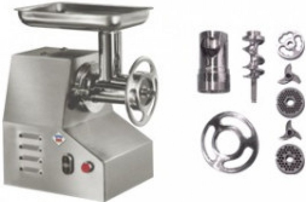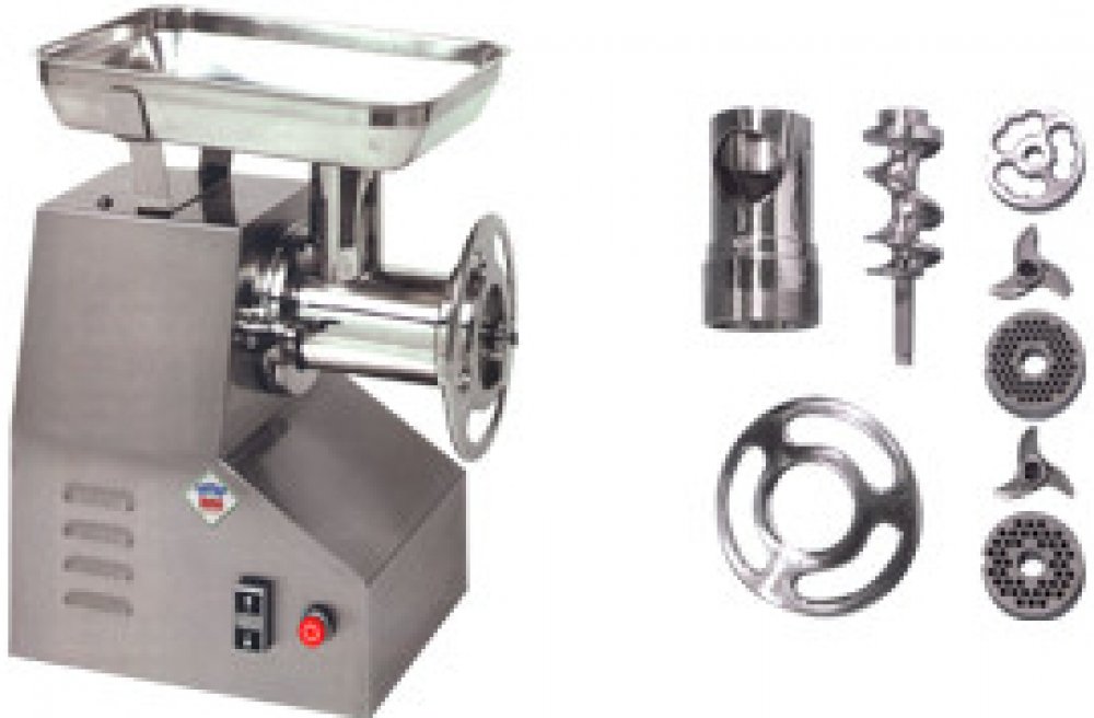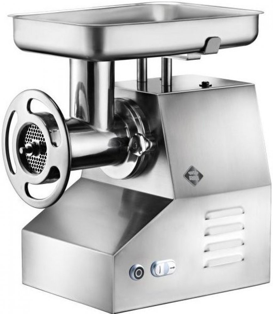 Profesionální mlýnek na maso RM Gastro vhodný do prodejen maso-uzeniny. Dvojsložení, celonerezové provedení, mlýnek je vybaven odnímatelnou hlavou, spínač pravý / levý chod, příslušenství: miska na produkt, tlačný kolík z plastu. Vnější matrice pr. 100 mm, průměr matrice 8 + 4,5mm dvojsložení. Součástí balení 2x nůž, šnek a 3x matrice. Široký sortiment desek a nožů do masomlýnků - připište do pozn...