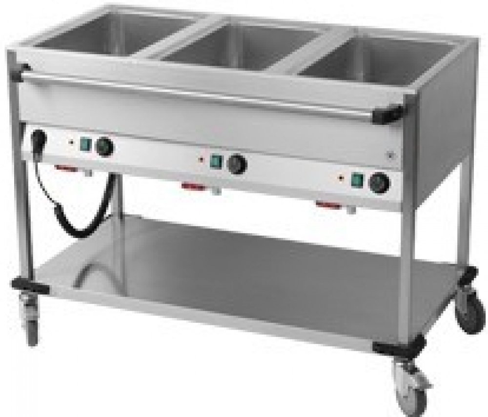 BMPD 3120 Pojízdná vodní lázeň pro 3xGN1/1-200 je vyrobena z chromniklové oceli 18/10 a jsou dodávány se 4 otočnými kolečky z toho 2 s brzdou. Jednotlivé vany jsou určeny pro výdej z gastronádob 1/1 popř. menších. Hloubka gastronádob může být až 200 mm. Každá vana disponuje samostatným vyhříváním topným tělesem a samostatným termostatem pro regulaci teploty lázně až do 90°C. každá vana je vybavena vypouštěcím kohoutem. Napájení vozíku je 230 V. Přívod je zajištěn točeným kabelem o max. dosahu 2 m.
