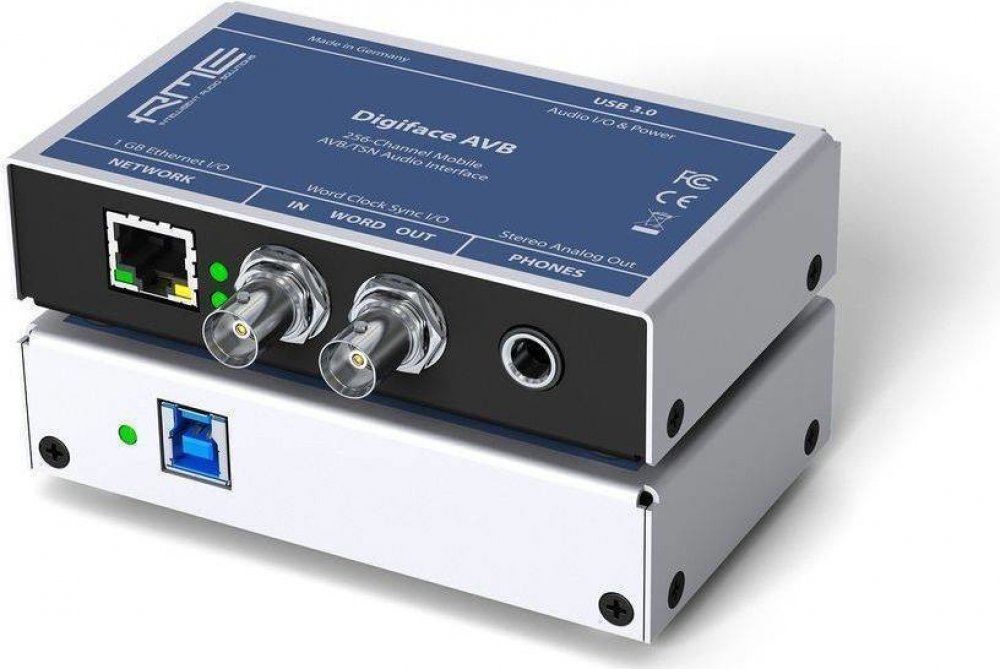 USB 3.0 audio rozhraní Digiface AVB Umožňuje záznam/playback 128 kanálů AVB do/z počítače PC/MAC v rozlišení 24bit/192kHz. Kanály lze organizovat ve treamů od 2 do 32 kanálů, což zajišťuje konektivitu se všemi AVB systémy na trhu. Vlastnosti: AVB USB 3.0 audio rozhraní Stream až 128 kanálů ve 192kHz z/do sítě AVB Součástí je AVDECC pro kompletní ovládání AVB sítě, směrování kanálů a monitoringu. Total Mix pro PC/MAC/iOS pro routing vstupů a výstupů Napájení z USB IEEE 802.1 BA compliant AVB Stack / IEEE 1722 AVTP / 1722.1 AVDECC compliant