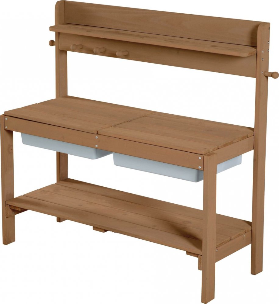 Typ produktu:Kuchyňka na hraníMinimální doporučený věk:1,5 rok/rokyDoporučené pohlaví:Chlapec/děvčeDoporučený věk:DětskýBarva:Světle šedá, DřevoMateriál:Plast, DřevoPovrchové zbarvení:VzorovanýVhodné pro použití uvnitř:AnoVhodné pro venkovní použití:AnoOdolnost proti povětrnostním vlivům:AnoSestavený:NeJednoduché sestavení:AnoRozvoj fantazie při hraní:AnoRozvoj a trénink dovedností:Trénink komunikačních dovedností, Trénink dovedností kreativního myšlení, Vývoj představivostiNutné baterie:NeHloubka:350 mmVýška:885 mmŠířka:895 mmHmotnost:10,2 kg Dětská zahradní kuchyňka roba "Fun" Outdoor + na písek, vodu a bláto je vhodná pro děti od 18 měsíců do 8 let a lze ji zatížit až 25 kg. Kuchyňka je vyrobena z vysoce kvalitního, robustního, glazovaného masivního dřeva odolného proti povětrnostním vlivům. Dětská kuchyňka v barvě teaku je obzvláště odolná a nabízí chlapcům a dívkám zábavu při hře venku na zahradě, na terase i uvnitř v domě. V zimě lze zahradní kuchyňku přeměnit na ideální řemeslnický stolek v interiéru s odkládací plochou na tužky, modelínu a řemeslnické materiály. Všestrannou dětskou zahradní kuchyňku lze použít jako pracovní stůl nebo stůl na hraní a díky dvěma odnímatelným krytům také jako blátivý stůl. Dvě odnímatelné plastové vaničky (VxŠxH: 9 x 38,5 x 32 cm každá) integrované pod kryty jsou vyrobeny z robustního plastu a jsou ideální na hraní a snadno se čistí. Úložný prostor zajišťuje velká police pod plastovými vaničkami a police nad nimi (v: 79 cm). Praktický háček slouží jako závěs na příslušenství. Stabilní konstrukce bez viditelných šroubů v horních panelech a zaoblené rohy vhodné pro děti zajišťují optimální bezpečnost pro nejmenší. Přehledný návod k montáži usnadňuje montáž svépomocí. Dětská venkovní + zahradní kuchyňka, která je registrována pro ochranu, byla vyrobena udržitelným způsobem z masivního dřeva a vyrobena podle normy EN71-1:2014+A1:2018. Všechny materiály v kuchyňce na hraní jsou testovány na škodlivé látky, certifikovány a pravidelně kontrolovány během výroby. Povrchy univerzální bahenní kuchyňky jsou omyvatelné a snadno se čistí. Rozměry zahradní kuchyňky jsou: (VxŠxH) 88,5 x 89,5 x 35 cm. U kolekce roba Outdoor + byla zvláštní pozornost věnována stabilní konstrukci. Všechny výrobky Outdoor + jsou vyrobeny z robustního masivního dřeva. Kolekce Outdoor + je odolná vůči povětrnostním vlivům a mimořádně trvanlivá.