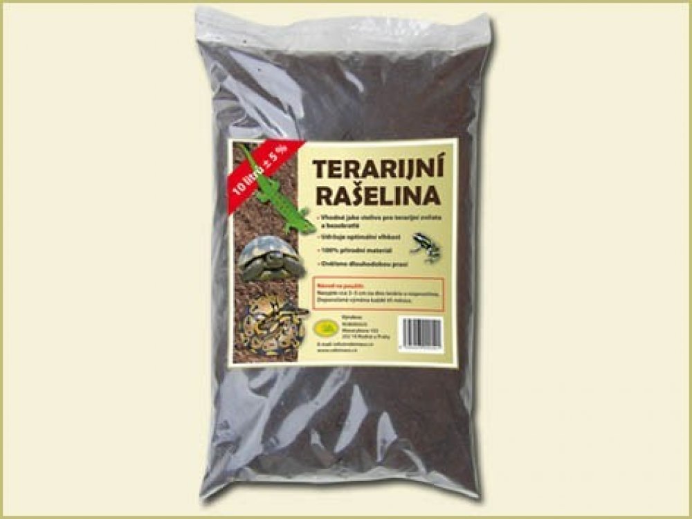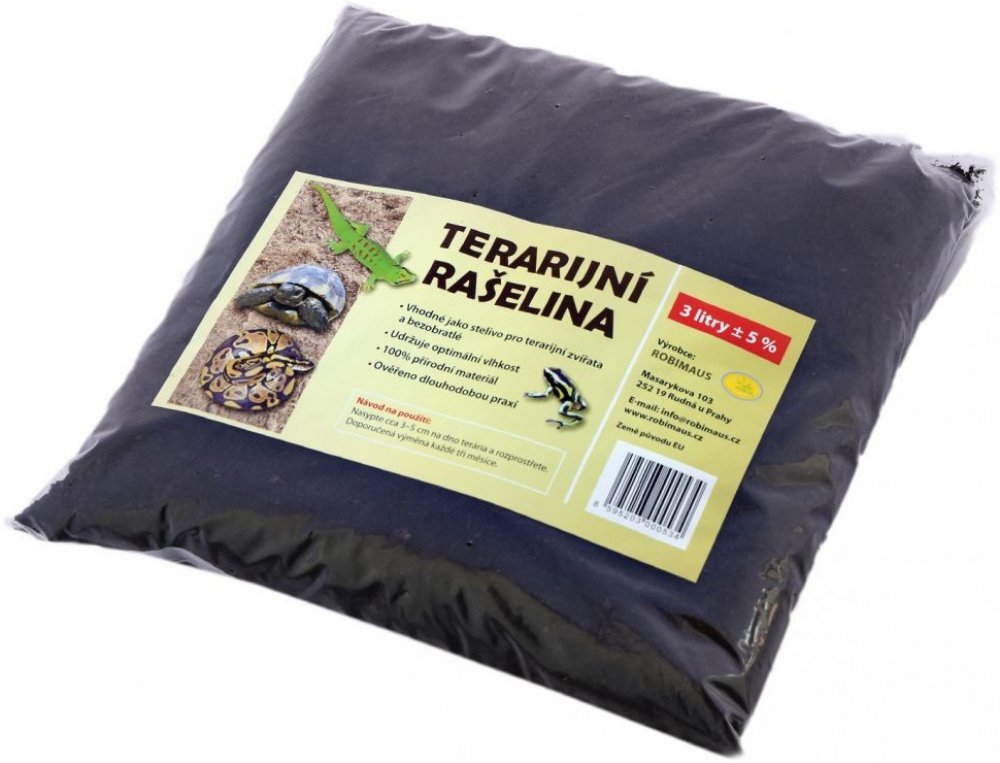 Robimaus Terarijní rašelina je neupravovaná 100% přírodní těžená rašelina. Osvědčená terarijní podestýlka pod mnoho druhů terarijních zvířat, kterými jsou například žáby, obojživelníci, pavouci, šneci, bezobratlí. Je vhodná i pro další zvířata obývající spodní patra tropického deštého pralesa nebo vlhké subtropické lesy (chameleony, vlhkomilné ještěry a gekony, vodní agamy, lesní želvy a hady a da...