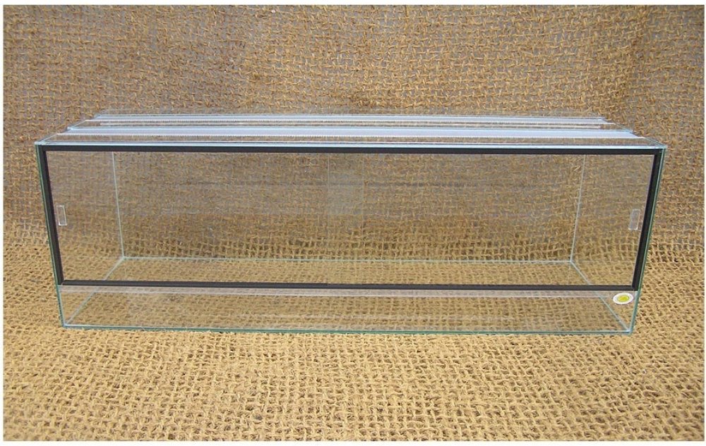 Otevírání terária je řešeno pomocí dvou proti sobě posuvných skleněných dvířek - tzv. "šoupaček", které jsou vyjímatelné, mezera mezi skly je 3 mm. Skleněná podélná výztuha, která je nalepená uvnitř terária na stropě, zaručuje pevnost i předního dílu stropu. A zároveň 2 otvory o průměru 10 mm ve výztuze mohou posloužit jako úchyt pro tepelný zdroj. Ve stropě jsou zabudovány 2 větrací hliníkové děrované plechy o šířce 70 mm pro dostatečné větrání. Tento plech lze snadno perforovat a lze jím protáhnout přívodní kabel k osvětlení nebo přichytit osvětlovací těleso. Terárium je profesionálně slepené speciálním transparentním (průhledným) silikonem. Síla skla 5 mm odpovídá normám EU. Hrany jsou dokonale zabroušené na moderní úkosové brusce.Doporučujeme přikoupit měkkou podložku.