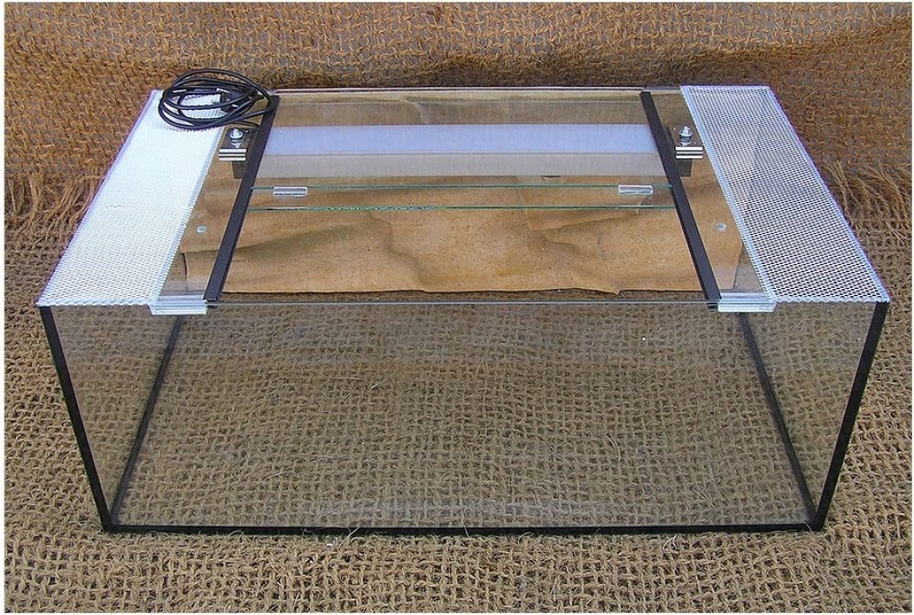 Otevírání terária je řešeno pomocí posuvných skleněných dvířek ve stropě - tzv. "šoupaček", které jsou vyjímatel...