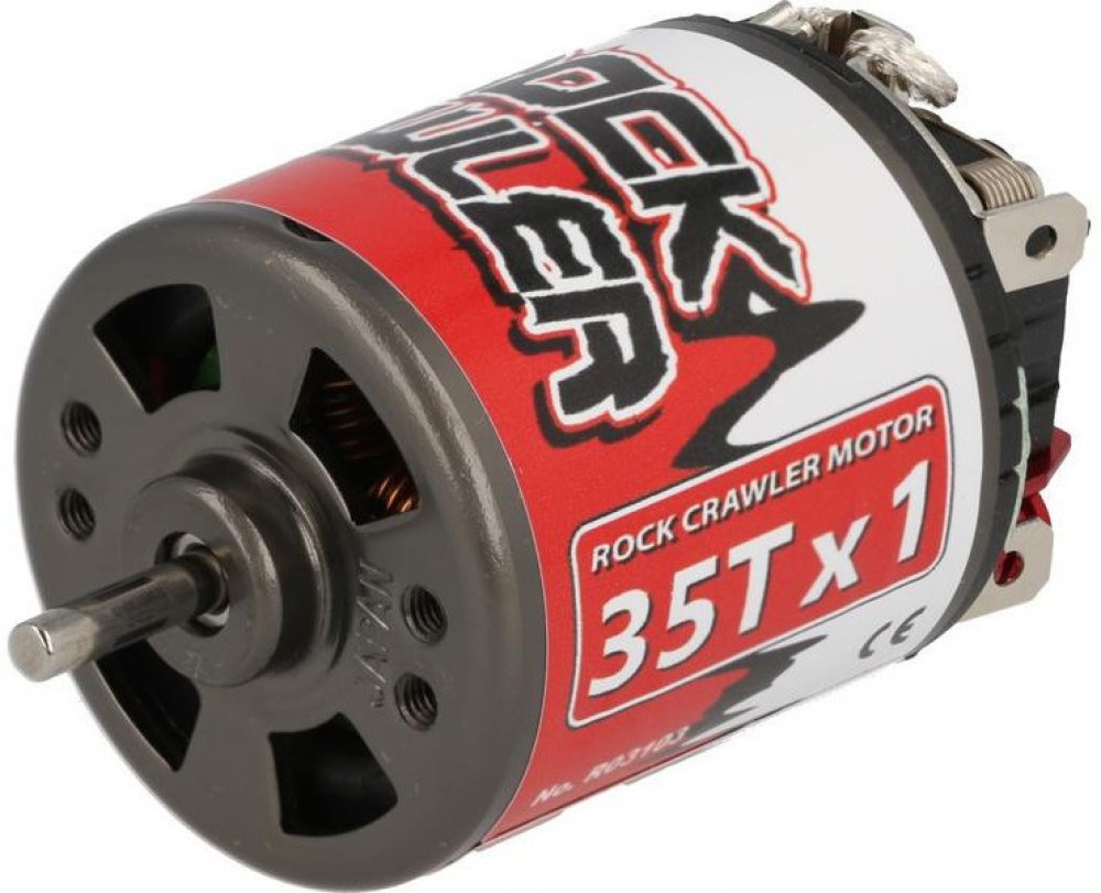 Precizní japonský stejnosměrný motor Robitronic Rock Crawler řady 540 s 35 závity pro nejnáročnější aplikace. Motor má kuličkové ložiska, velmi tichý chod s minimem vibrací a díky velmi malé mezeře mezi statorem a rotorem velký kroutící moment. Kartáče jsou ze směsi stříbra a uhlíku.