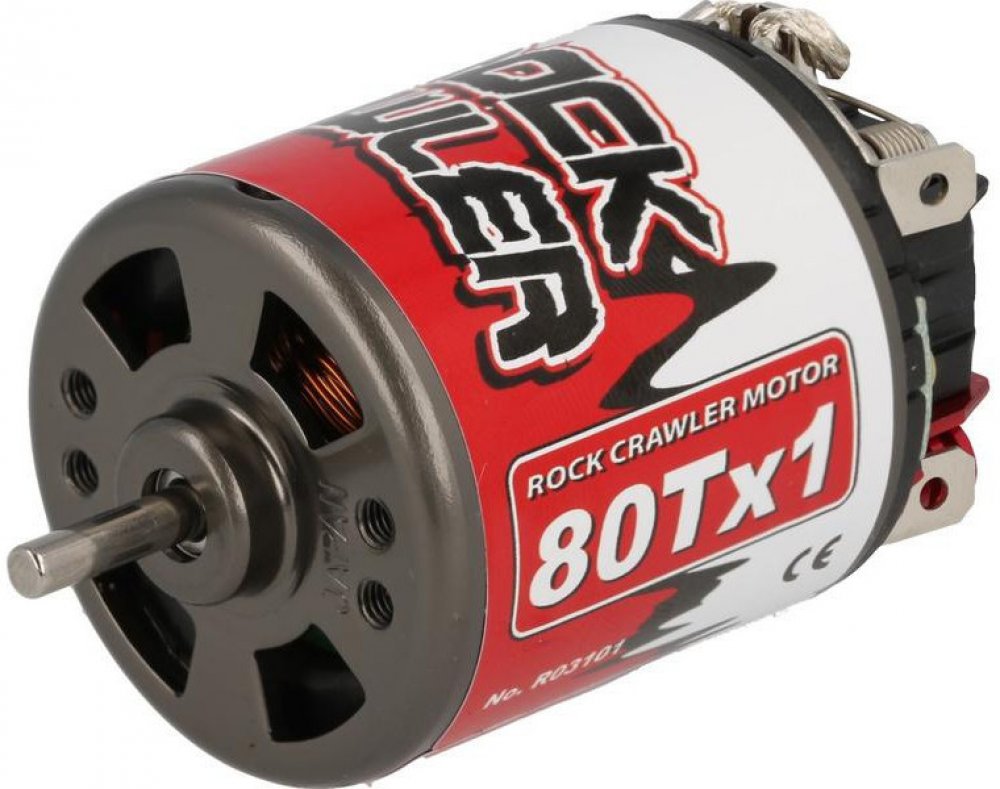 Precizní japonský stejnosměrný motor Robitronic Rock Crawler řady 540 s 80 závity pro nejnáročnější aplikace. Motor má kuličkové ložiska, velmi tichý chod s minimem vibrací a díky velmi malé mezeře mezi statorem a rotorem velký kroutící moment. Kartáče jsou ze směsi stříbra a uhlíku.