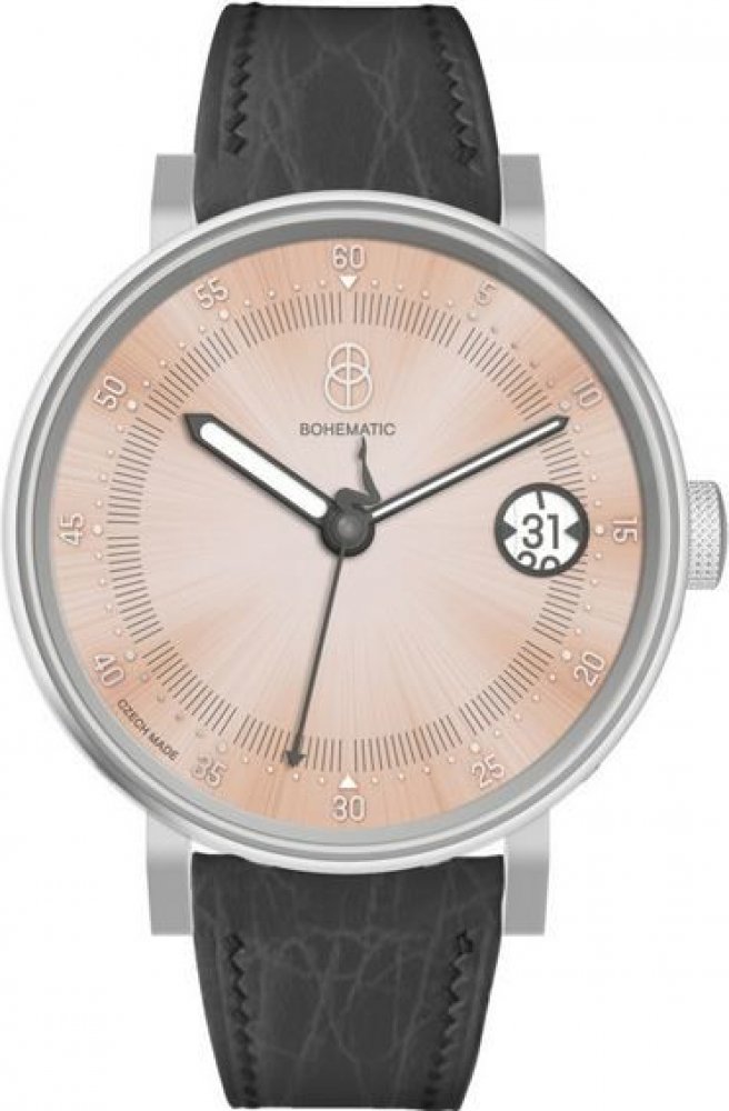 Růžový reliéfní číselník s efektem slunce je doplněn antracitovou sekundovou ručkou, jejíž konec zdobí ladné křivky nohy jedné ze Sutnarových Venuší. Hodinky pohání mechanický kalibr Eterna s můstkem ručně dekorovaným siluetou venuších nohou, vystavenou na odiv pod safírovým víkem. Nerezová luneta uchycená dvanácti šroubky je povrchově upravena do vysokého lesku, který přirozeně kontrastuje se sat...