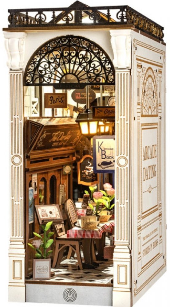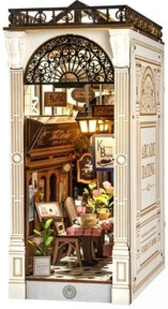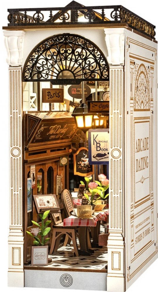 Proměňte svou knihovnu v romantický kout díky skládačce pasáže s knižním zákoutím a kavárnou. Malebná pasáž v evropském stylu vytváří dokonalou atmosféru pro první rande či přátelská setkání. Teplé světlo tří zavěšených lamp naplňuje pasáž útulnou atmosférou a upozorní na posezení zastrčené mezi kavárnou a knihkupectvím. Kavárna vyzařuje pohodu díky rustikálním dřevěným detailům, zatímco fasáda knihkupectví s vintage nápisy a knihami nabízí pohled do světa nekonečných příběhů. Horní část je ozdobena detailně propracovanou mříží a zábradlím na střeše. Pozvěte svou rodinu nebo přátele a užijte si zábavné tvoření bez nutnosti použití lepidla nebo nástrojů. Všechny díly skládačky jsou přesně vyřezané a lehce do sebe zapadnou, aby výsledek byl stabilní a odolný. Plastová fólie ochrání Váš výtvor před prachem a nečistotami. Dodáváno s podrobným návodem k sestavení. Hlavní vlastnosti: 148 precizně vyřezaných dílůsnadná montáž bez použití lepidla a nástrojůrozvíjí logické a motorické dovednostipodporuje trpělivost ideální jako dárek nebo jedinečná dekoracestřední obtížnostLED osvětleník napájení slouží 2xAAA baterie (nejsou součástí balení)včetně ochranné fólienávod k sestavení je součástí balení