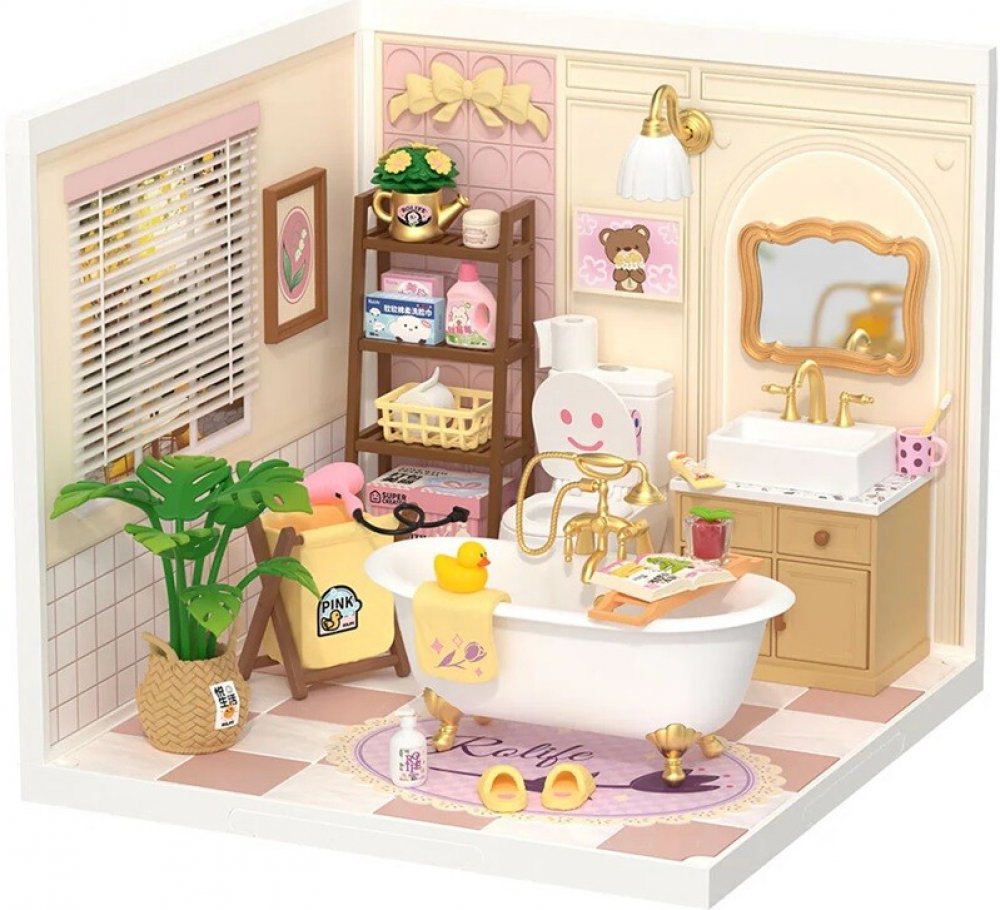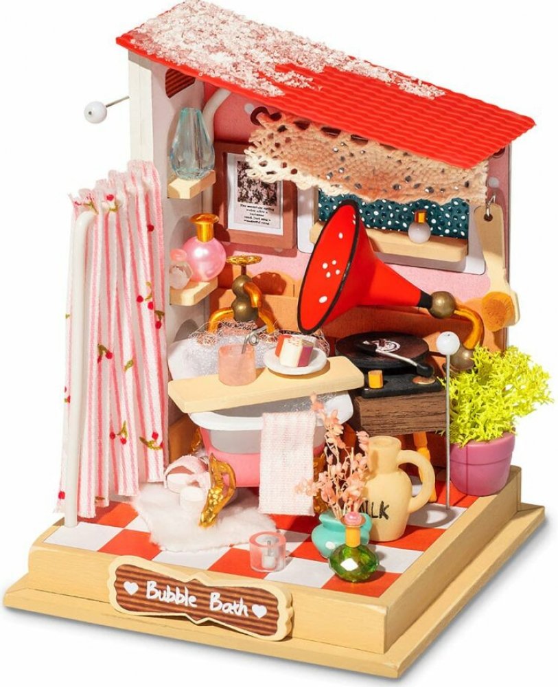 DIY sada Představte si, jak si po náročném dni plném práce napustíte horkou vanu, připravíte si voňavou pěnivou koupel a užíváte si pocit pohody a uvolnění. Koupelna v kombinaci pastelově růžové a bílé barvy s vanou se zlatými nožičkami, toaletou s „usmívajícím se“ víkem a dalšími stylovými doplňky je kompletně vybavená všemi potřebnými drobnostmi, jako je fén, ručníky, bačkůrky a další nezbytnosti, např. roztomilá žlutá kachnička, noviny ke čtení i potřeby pro praní. Spojením různých miniatur řady Super Creator Series vertikálně nebo horizontálně můžete vytvořit různorodý komplex domečků. Ochraňte svůj výtvor pomocí krytů proti prachu a nečistotám – DWP05 Dveře proti prachu B a DWP02 Střecha typu B. Skládání skládačky podporuje rozvoj jemné motoriky, prostorového myšlení a trpělivosti. Je to možnost, jak kombinovat zábavu se vzděláváním. Všechny přesné dílky do sebe lehce zapadnou, aby výsledek byl stabilní a odolný, a to bez použití lepidla. Skládačka je dodávána v nesloženém stavu, zabalená v krabici s podrobným návodem k sestavení. Hlavní vlastnosti: 103 dílkůdoba skládání 45 minLED osvětleník napájení slouží kabel USB-C (je součástí balení)sestavení bez použití lepidlavýjimečný vzhledvhodné pro děti i dospělérozvíjí logické a motorické dovednostipodporuje trpělivost dětíideální jako dárek nebo jedinečná dekoracemožnost spojení více miniaturk dokoupení kryty proti prachu – DWP05 a DWP02 Společnost RoboTime, založená v roce 2007, se specializuje na navrhování, výrobu a prodej dřevěných vzdělávacích skládaček, hraček pro děti i dospělé. Dnes již nabízí více než 400 dřevěných skládaček typu DIY (udělej si sám). Její výrobky zahrnují robotické dinosaury, architektonické modely i stavebnice autíček a letadel. Jejím cílem je vytvářet zábavu, která vykouzlí úsměv na tváři každého. Věří, že kvalita je na prvním místě, a stále se proto drží toho, aby její výrobky dosahovaly světových standardů, jako jsou FSC®, BSCI atd.Adresa a kontakt výrobce: RoboTime Europe LTD