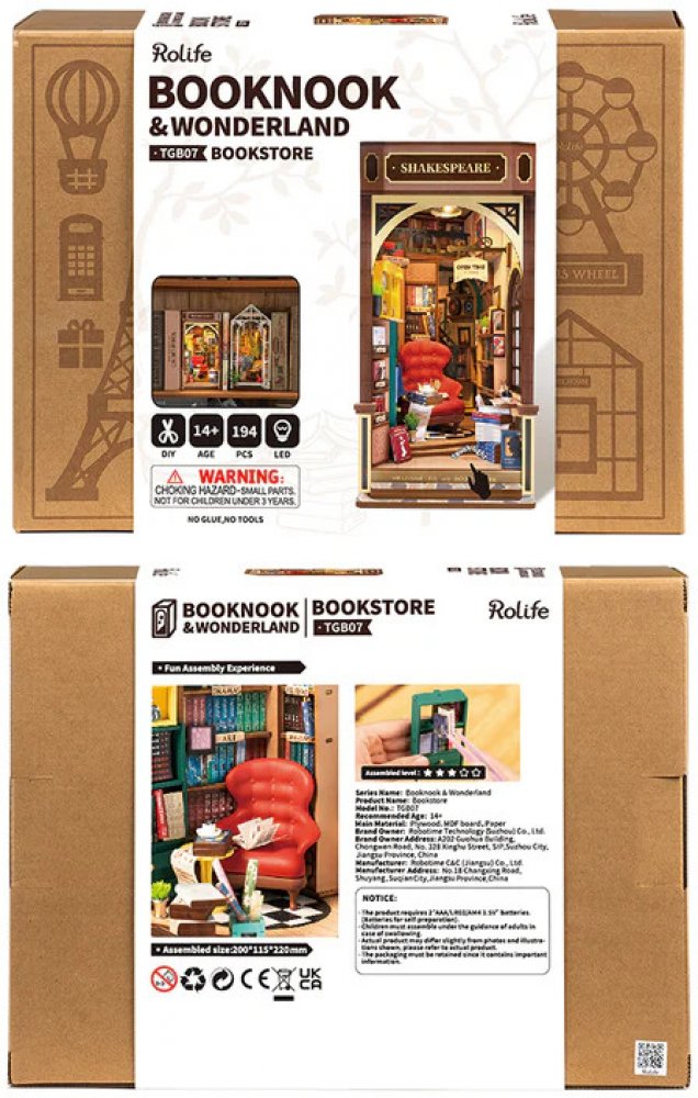 DIY sadaKousek italského životního stylu a historie u Vás doma. Vneste kousek Itálie mezi své knihy. Představte si romantickou projížďku lodí Benátským kanálem mezi italskými památkami. Toto DIY puzzle vám umožní vlastnit kousek města, protože zobrazuje proslulou gondolu, Canal Grande, Teatro La Fenice, obchod s maskami a kavárnu. Zarážka na knihy byla navržena s takovou precizností a autenticitou, že zachycuje klid města v malém knižním koutku. Benátský kanál je úžasně vyobrazen pomocí průhledného plastu, díky kterému je vodní efekt realističtější. A tento nádherný pohled ještě umocňuje LED osvětlení. Tato zarážka na knihy je z přední i horní strany chráněna před prachem a nečistotami průhlednou fólií. Zacvakávací díly usnadňují identifikaci při jejich skládání. Ideální dárek pro zvláštní příležitost nebo vhodné jako dekorační předmět do Vaší knihovny. Osvětlení pomocí LED je ovládáno moderním dotykovým spínačem a všechny jeho součásti jsou přizpůsobeny ke snadné vestavbě. Mikrotužkové baterie potřebné k napájení nejsou součástí stavebnice. Dodáváno s podrobným návodem k sestavení. Hlavní vlastnosti:efekt plovoucího městasnadná montáž s přesnými díly bez použití lepidlaideální dárek nebo dekoracepodporuje logické a motorické dovednostitrénuje trpělivost dětíLED osvětleníhrdost z dokončení Společnost RoboTime, založená v roce 2007, se specializuje na navrhování, výrobu a prodej dřevěných vzdělávacích skládaček, hraček pro děti i dospělé. Dnes již nabízí více než 400 dřevěných skládaček typu DIY (udělej si sám). Její výrobky zahrnují robotické dinosaury, architektonické modely i stavebnice autíček a letadel. Jejím cílem je vytvářet zábavu, která vykouzlí úsměv na tváři každého. Věří, že kvalita je na prvním místě, a stále se proto drží toho, aby její výrobky dosahovaly světových standardů, jako jsou FSC®, BSCI atd.Adresa a kontakt výrobce: RoboTime Europe LTD