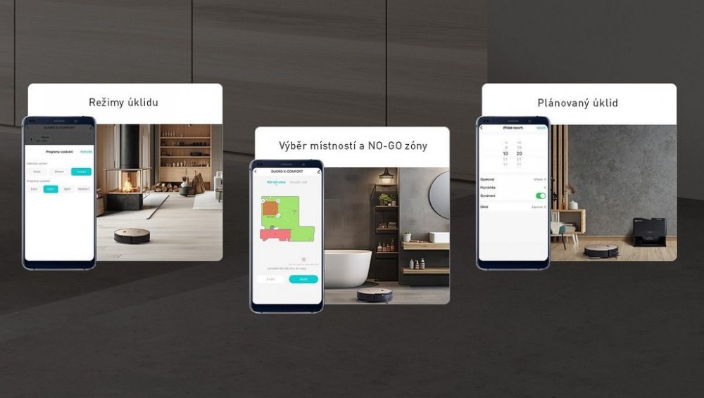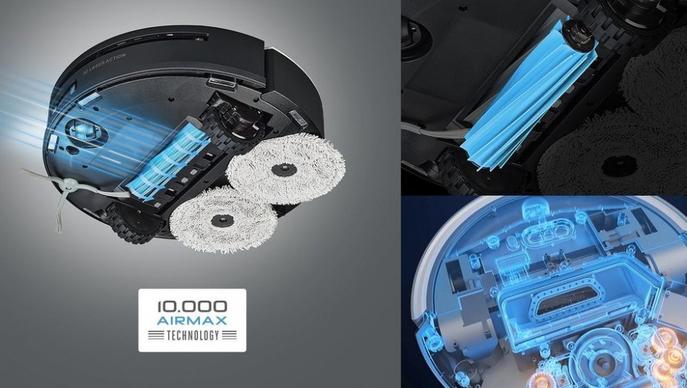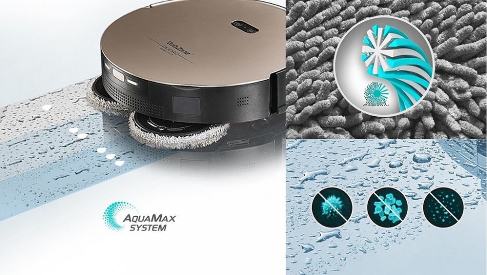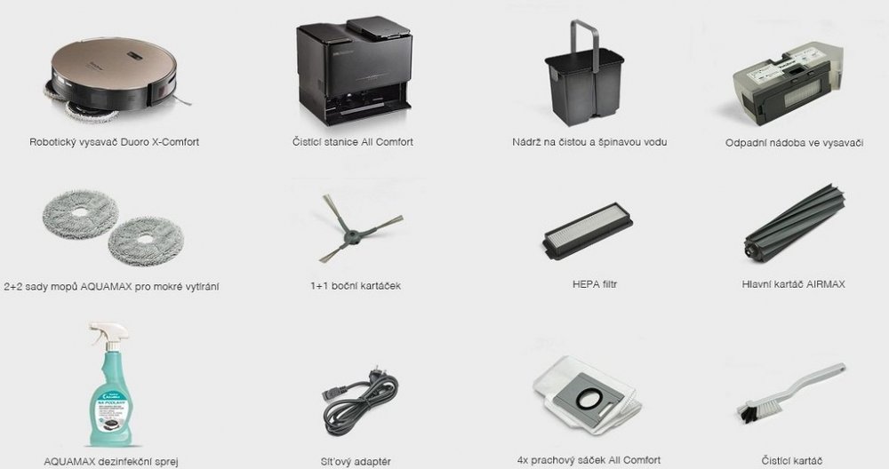 Absolutní komfort užívání s minimální obsluhou Úklid neomezeně velkého prostoru s výkonem 72 W Nová generace rotačního vytírání AQUAMAX Automatické praní a vysoušení mopů Komunikace a aplikace v češtině Navíc Profi kufřík s příslušenstvím