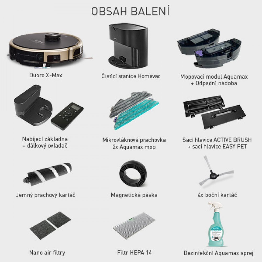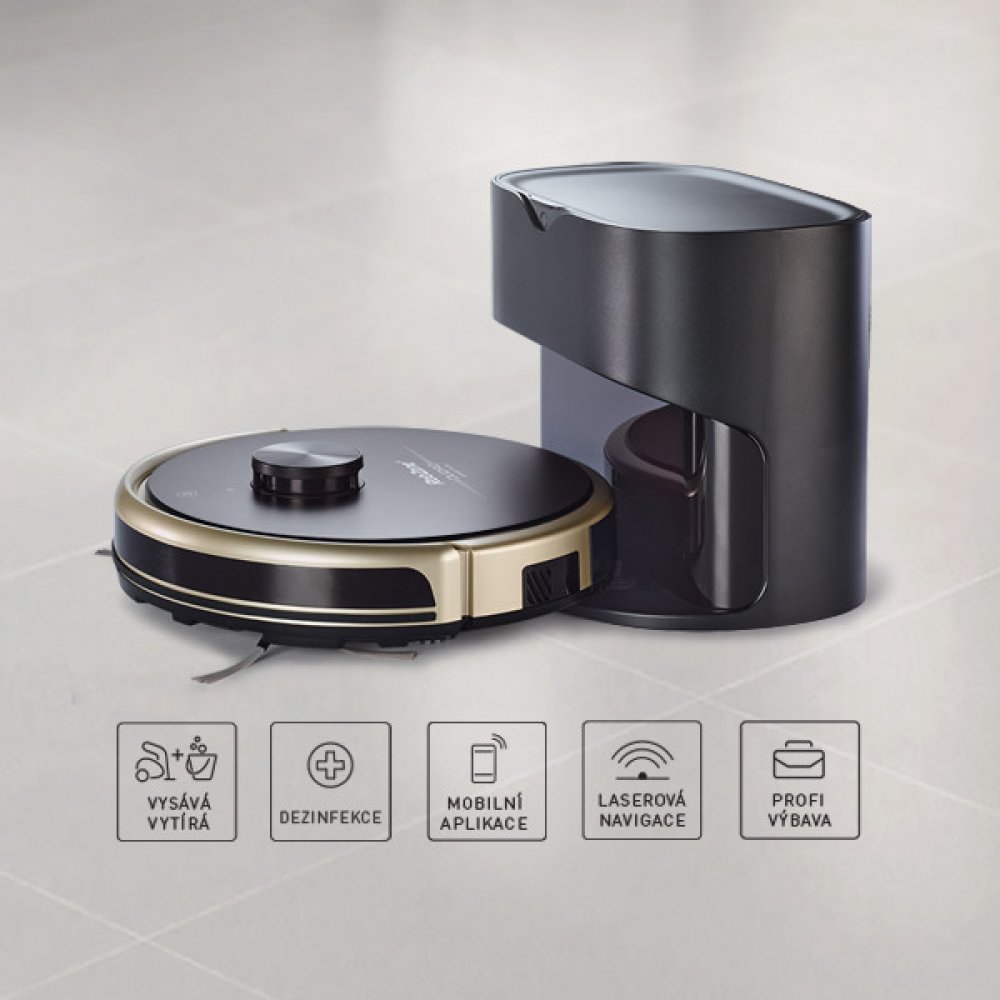 Hloubkové turbo sání Airmax 10 000 Elektronicky řízené vytírání AQUAMAX Vysoce účinná uhlíková filtrace Laserová navigace se zónovým úklidem Komunikace a aplikace v češtině Navíc Profi kufřík s příslušenstvím