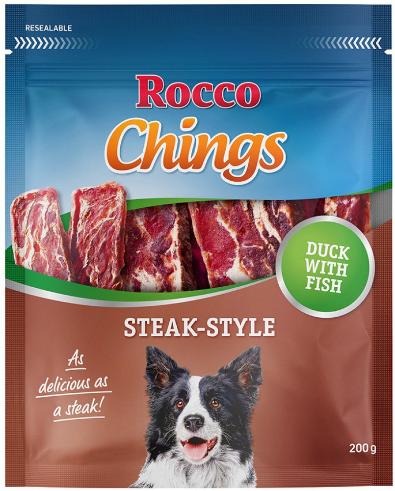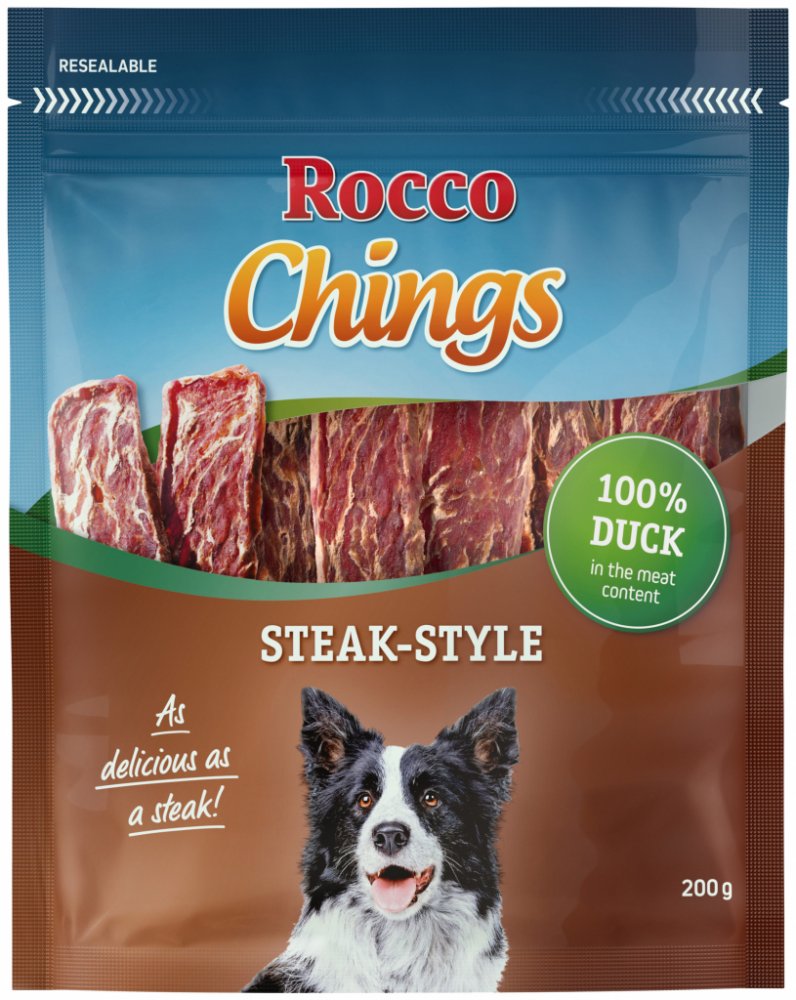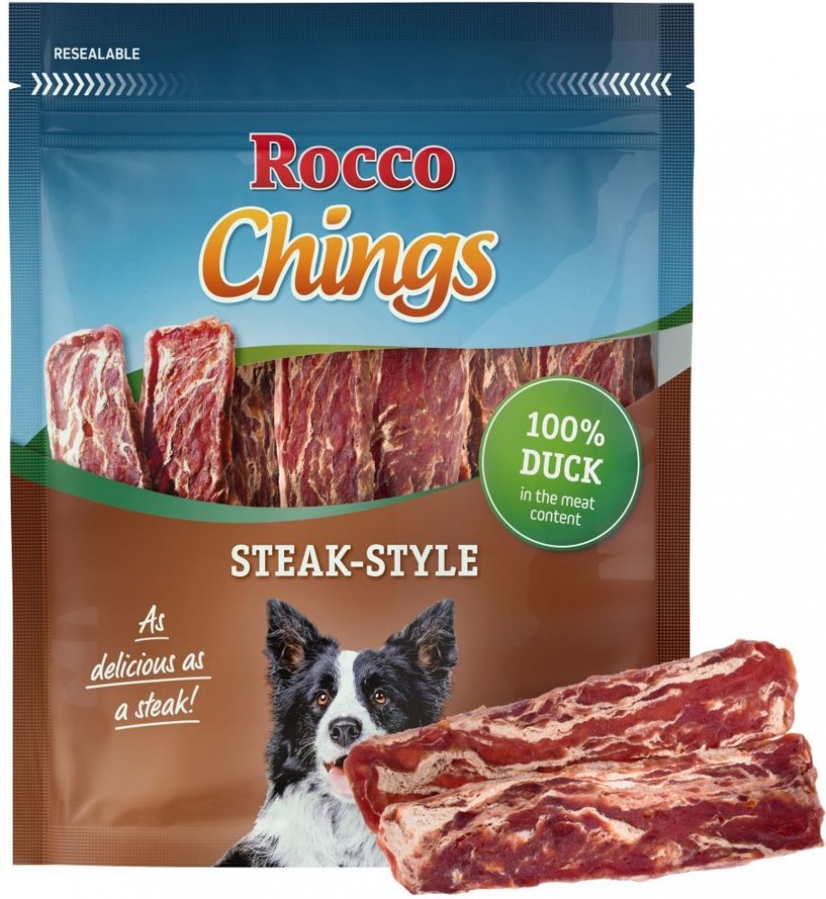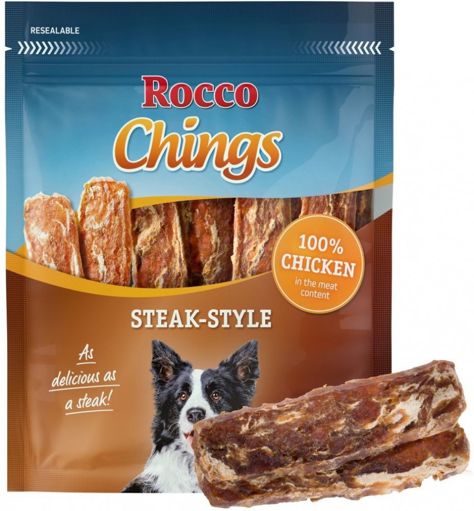 Rocco Chings Steak Style sestává z těch nejchutnějších vrstev kuřecího nebo kachního masa, které je protknuté jemným mořským lososem - to vše v zákazníky oceňované Rocco Chings prémiové kvalitě. Pamlsek nevypadá pouze rafinovaně, ale i báječně chutná. Mramorování je zapříčiněno vrstvou lososa a láká svým vzhledem, je to opravdu něco pro chuťové pohárky. Zcela ve stylu Rocco Chings výrobků zůstává i fakt, že je zachováno původní intenzivní masové aroma díky šetrnému sušení vzduchem. Nový Rocco Snack vypadá jako steak a taky je tak okouzlující! Kvalitní kousky masa zařídí plnohodnotný zážitek z kousání, který okouzlí každého pejska, ať už bude patřit k malým nebo velkým plemenům. Tak lehký a dobře stravitelný jak jen Rocco Chings Snacky umějí být. Rocco Chings Steak Style jsou přírodní produkty. Pro jejich výrobu bylo použito jen maso prémiové kvality, žádná masokostní moučka nebo zbytky masa. Díky opravdu šetrné úpravě skrze sušení a zřeknutí se umělých aromat a barviv, vznikl zcela přírodní snack plný masa, který je předporcovaný do jednotlivých pásků. ¨ Díky praktickém znovuuzavíratelnému balení zůstává snack dlouho čerstvý: Prostě otevřete a odměňujte zas a znova! Rocco Chings Steak Style je dostupný v následujících variantách Kuřecí maso přes 70 % šťavnatých kuřecích filetů proložených tím nejlahodnějším lososem - ideální snack, který navíc neobsahuje nadbytek tuku Kachní maso přes 70 % delikatesních kachních filetů doplněných tím nejlepším mořským lososem – skutečný zážitek i pro velmi vybíravé jedince Rocco Chings Steak Style – obzvlášť lahodný a chutný snack na potom, Váš pejsek jej bude milovat!