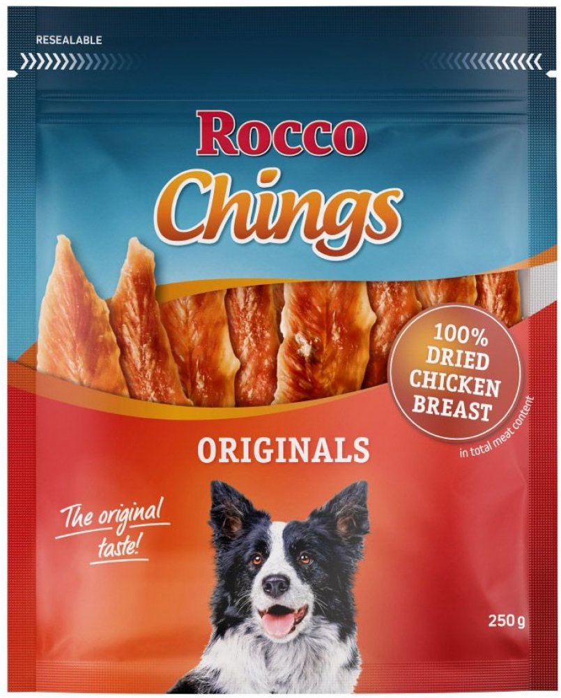 Dobrá zpráva: oblíbené Rocco Chings sušené maso přicházejí v novém obalu! Ve fázi přechodu na nové balení může Vaše objednávka obsahovat produkty jak ve starém, tak i novém designu. Rocco Chings jsou vyrobené výhradně z čerstvého masa - ne z masové moučky, a také neobsahují zvířecí vedlejší produkty. Plátky jsou šetně sušené vzduchem. Kvalitní kuřecí, kachní či hovězí maso je nízkotučné a velmi dobře stravitelné. Masové plátky jsou neobsahují obiloviny a obsahují jen jeden zdroj bílkovin. Díky tomu jsou plátky vhodné i pro citlivé nebo alergické psy. S Rocco Chings poskytnete Vašemu pejskovi chutný pamlsek z čistého masa, bez obsahu barviv, konzervačních látek a aromat. Díky praktickému uzavíratelnému obalu zůstane Rocco Chings sušené maso extra dlouhou dobu čerstvé, proto je ideální svačinkou mezi jídly: Balení můžete jen otevřít a opět odměňovat! K dispozici jsou následující Rocco Chings varianty: 250 g tyčinky z kuřecích prsíček 250 g kuřecí prsíčka, sušená 170 g kachní prsa 250 kachní prsa proužky 120 g hovězí 200 g králičí Rocco Chings sušené maso pro psy - skvělá chuť v prvotřídní kvalitě pro Vašeho čtyřnohého kamaráda! Vezmětě prosím na vědomí, že tato nabídka se vztahuje pouze na produkt č. 535880. Rocco Chings Video: Tento produkt nelze doručit do Švýcarska!