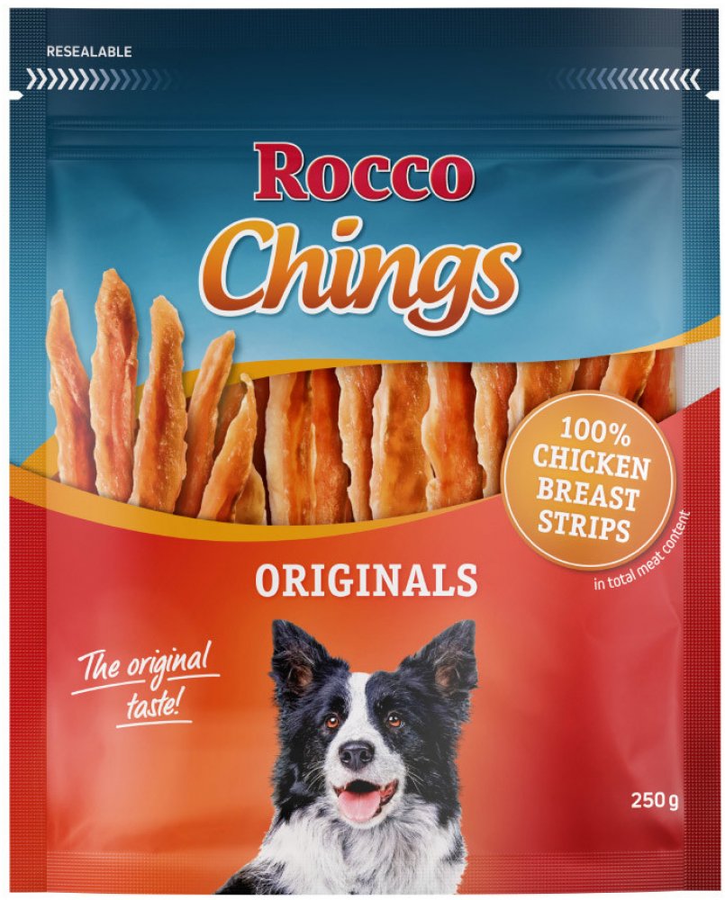 Rocco Chings jsou vyrobené výhradně z čerstvého masa - ne z masové moučky, a také neobsahují zvířecí vedlejší produkty. Plátky jsou šetně sušené na vzduchu. Kvalitní kuřecí nebo kachní maso je nízkotučné a velmi dobře stravitelné. Díky tomu jsou plátky vhodné i pro citlivé nebo alergické psy. S Rocco Chings sušeným masem poskytnete Vašemu pejskovi chutný pamlsek z čistého masa, bez obsahu barviv, konzervačních látek a aroma. Sušené maso Rocco Chings je vyrobeno ze 100 % jemného masa, které je již předem porcované. Díky praktickému uzavíratelnému obalu zůstane Rocco Chings sušené maso extra dlouhou dobu čerstvé, proto jsou ideální svačinkou mezi jídly: Můžete je jen otevřít a opět odměňovat! K dispozici jsou následující Rocco Chings sušeného masa: 2 x 250 g / 4 x 250 g tyčinky z kuřecích prsíček: 100 % jemné kuřecí tyčinky, naporcované v plátcích 2 x 250 g / 4 x 250 g kuřecí prsíčka, sušená: 100 % křupavé pochoutky bez tuku 2 x 170 g / 4 x 170 g kachní prsa: 100 % prvotřídní kachní maso naporcované na proužky 2 x 120 g / 4 x 120 g hovězí maso: 100% vydatné a chutné hovězí maso. Rocco Chings sušené maso pro psy - skvělá chuť v prvotřídní kvalitě pro Vašeho čtyřnohého kamaráda! Více informací o Rocco Chings získáte zde: Rocco Chings žvýkací plátky Vezměte prosím na vědomí, že tato nabídka se vztahuje pouze na produkt č. 535929.