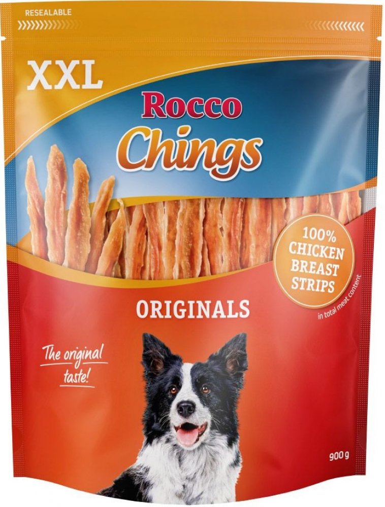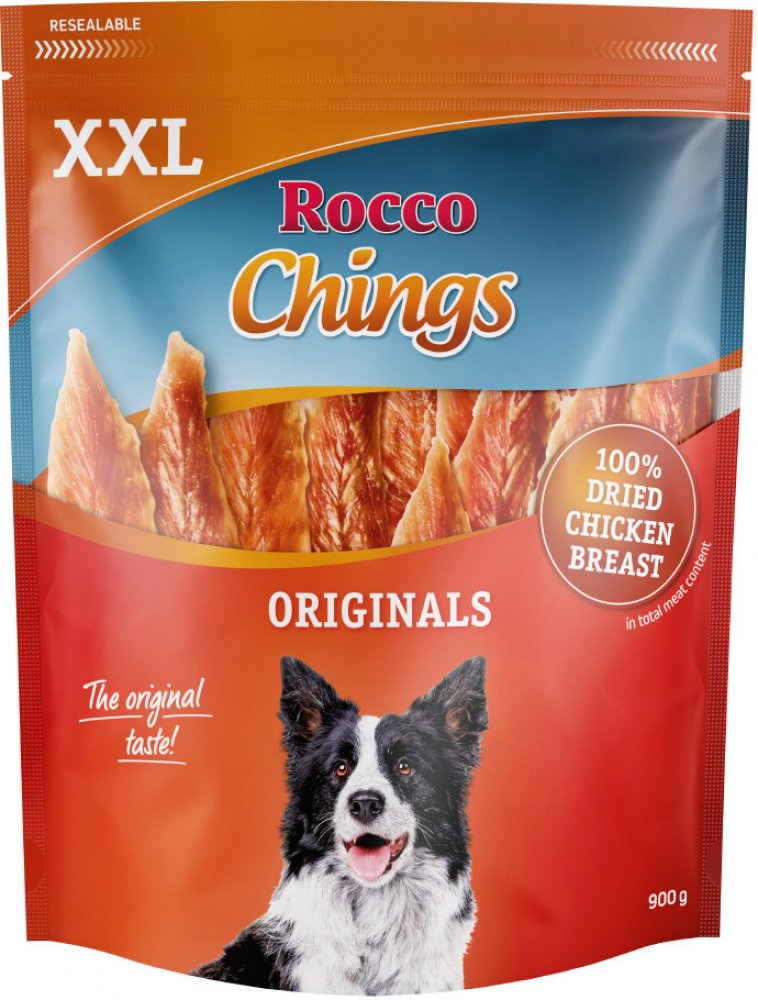 Rocco Chings Originals - Kuřecí prsa v plátcích - získaly si srdce nejednoho psa a to z dobrého důvodu: lahodné plátky jsou složeny z jemných kuřecích filetů, přitom jsou nízkotučné a lehce stravitelné. Díky uzavíratelnému balení zůstanou snacky dlouho čerstvé – Váš pes bude nadšený. XXL Pack je k dostání v následujících variantách: - Mix 900 g: 250 g kuřecí prsa - proužky, 250 g sušená kuřecí prsa, 250 g kachní prsa, 150 g hovězí - Kuřecí prsa - proužky 900 g - Sušená kuřecí prsa 900 g Tento výrobek není dostupný ve Švýcarsku!