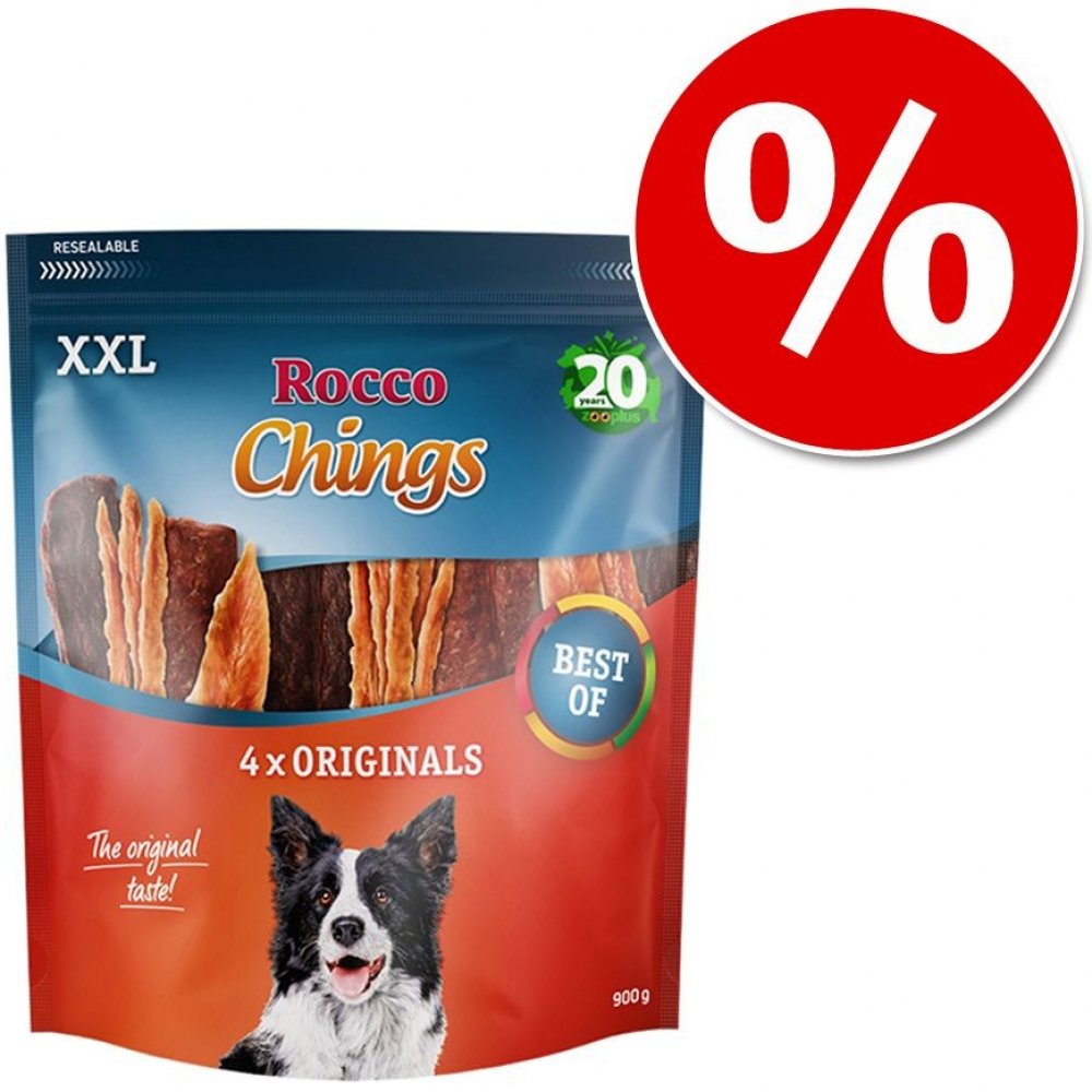 Rocco Chings Originals - Kuřecí prsa v plátcích - získaly si srdce nejednoho psa a to z dobrého důvodu: lahodné plátky jsou složeny z jemných kuřecích filetů, přitom jsou nízkotučné a lehce stravitelné. Díky uzavíratelnému balení zůstanou snacky dlouho čerstvé – Váš pes bude nadšený. XXL Pack je k dostání v následujících variantách: - Mix 900 g: 250 g kuřecí prsa - proužky, 250 g sušená kuřecí prs...