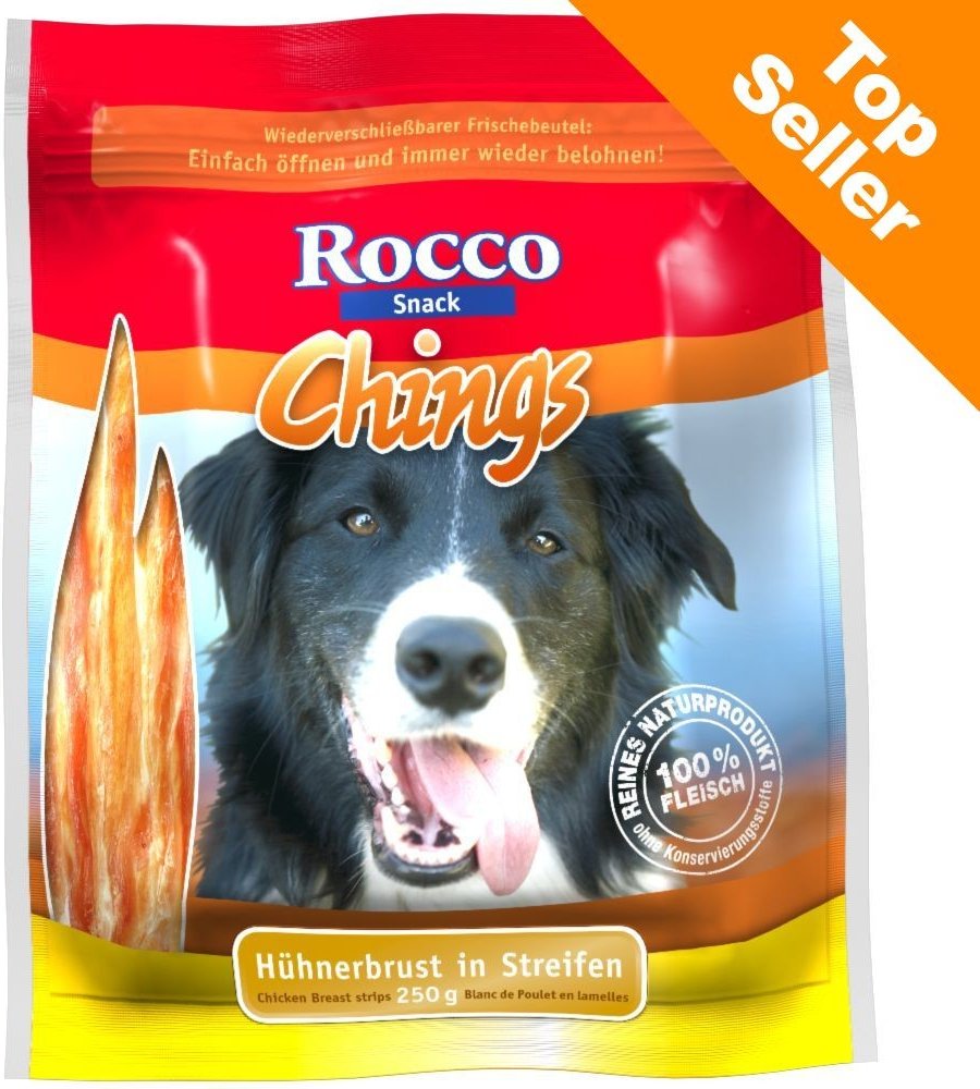 Dobrá zpráva: oblíbené Rocco Chings sušené maso přicházejí v novém obalu! Ve fázi přechodu na nové balení může Vaše objednávka obsahovat produkty jak ve starém, tak i novém designu. Rocco Chings jsou vyrobené výhradně z čerstvého masa - ne z masové moučky, a také neobsahují zvířecí vedlejší produkty. Plátky jsou šetně sušené vzduchem. Kvalitní kuřecí, kachní či hovězí maso je nízkotučné a velmi dobře stravitelné. Masové plátky jsou neobsahují obiloviny a obsahují jen jeden zdroj bílkovin. Díky tomu jsou plátky vhodné i pro citlivé nebo alergické psy. S Rocco Chings poskytnete Vašemu pejskovi chutný pamlsek z čistého masa, bez obsahu barviv, konzervačních látek a aromat. Díky praktickému uzavíratelnému obalu zůstane Rocco Chings sušené maso extra dlouhou dobu čerstvé, proto je ideální svačinkou mezi jídly: Balení můžete jen otevřít a opět odměňovat! K dispozici jsou následující Rocco Chings varianty: 250 g tyčinky z kuřecích prsíček 250 g kuřecí prsíčka, sušená 170 g kachní prsa 250 kachní prsa proužky 120 g hovězí 200 g králičí Rocco Chings sušené maso pro psy - skvělá chuť v prvotřídní kvalitě pro Vašeho čtyřnohého kamaráda! Vezmětě prosím na vědomí, že tato nabídka se vztahuje pouze na produkt č. 535880. Rocco Chings Video: Tento produkt nelze doručit do Švýcarska!