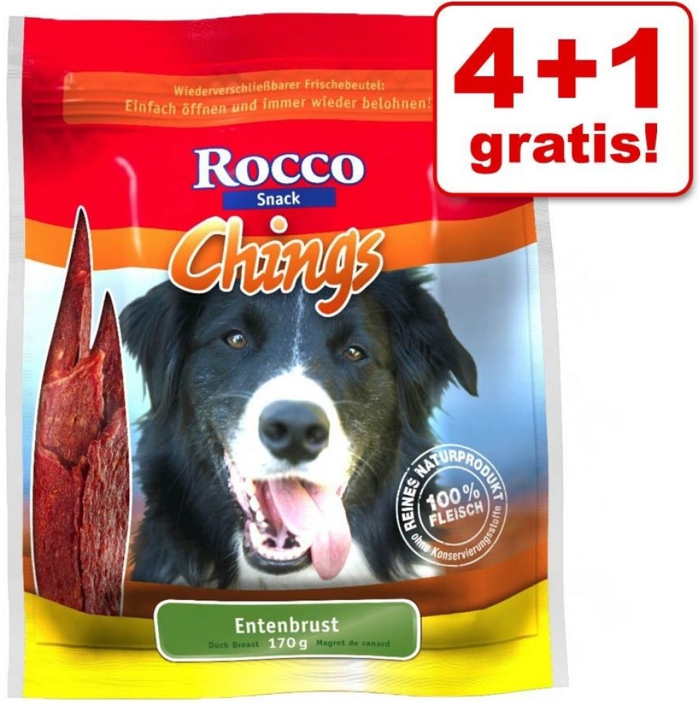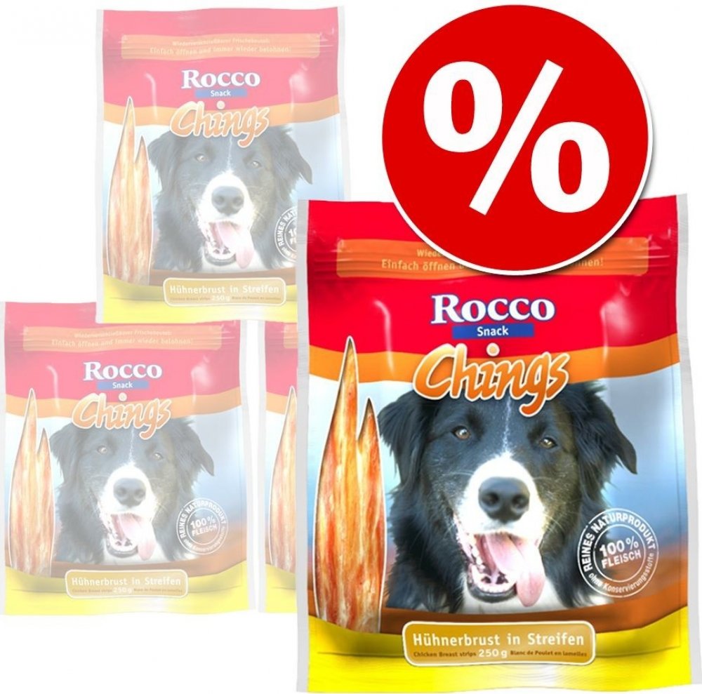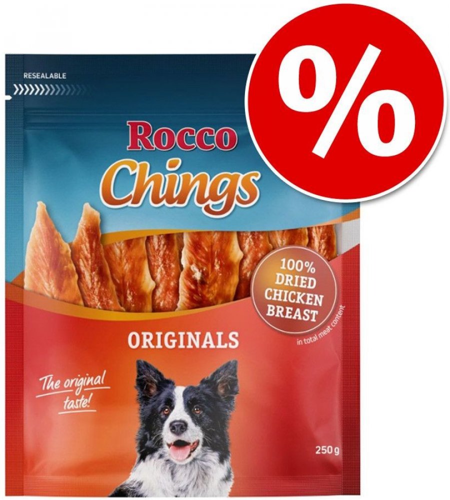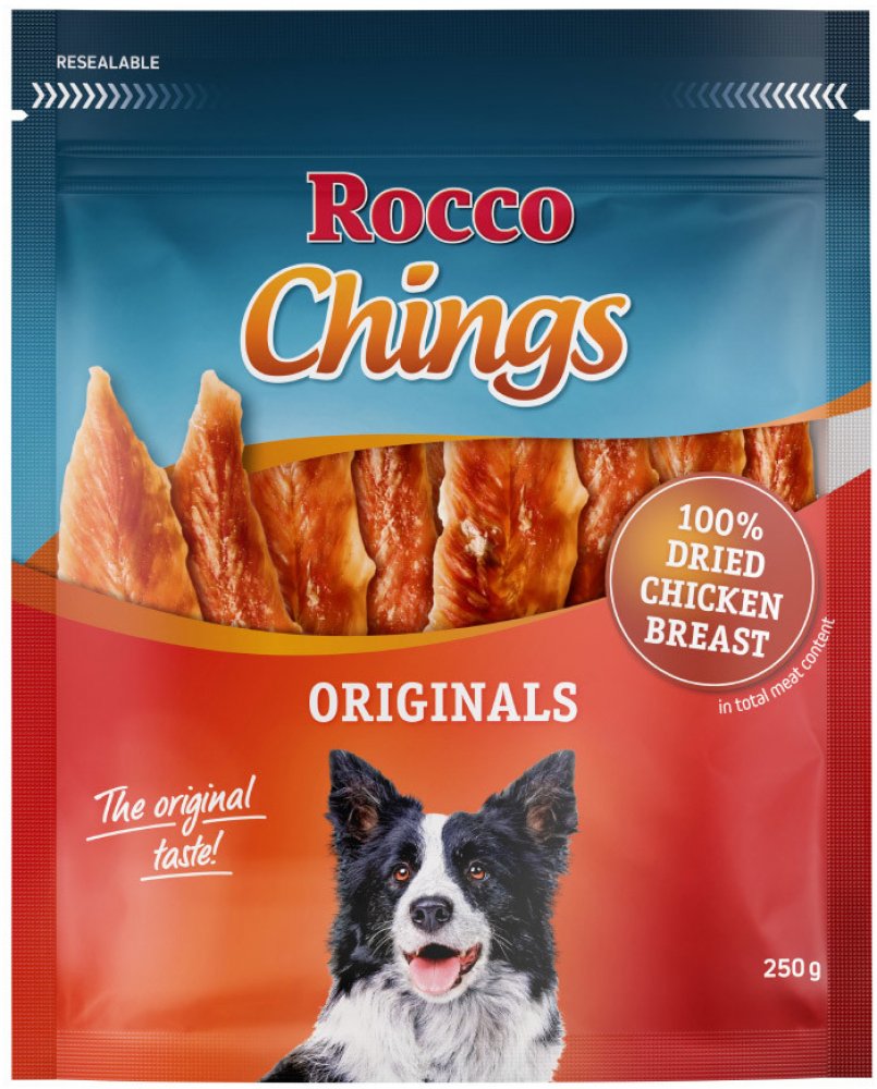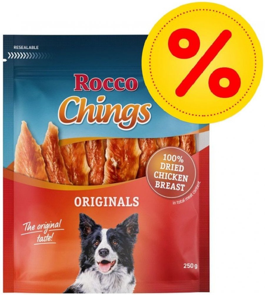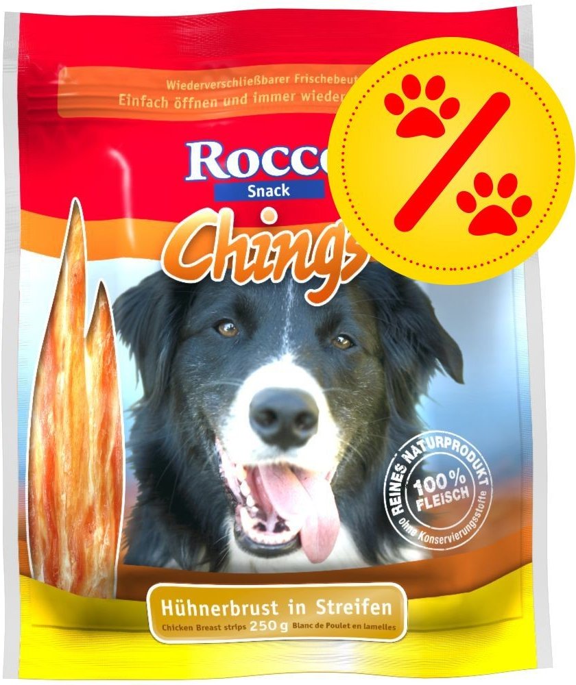 Rocco Chings jsou vyrobené výhradně z čerstvého masa - ne z masové moučky, a také neobsahují zvířecí vedlejší produkty. Plátky jsou šetně sušené na vzduchu. Kvalitní kuřecí nebo kachní maso je nízkotučné a velmi dobře stravitelné. Díky tomu jsou plátky vhodné i pro citlivé nebo alergické psy. S Rocco Chings sušeným masem poskytnete Vašemu pejskovi chutný pamlsek z čistého masa, bez obsahu barviv, konzervačních látek a aroma. Sušené maso Rocco Chings je vyrobeno ze 100 % jemného masa, které je již předem porcované. Díky praktickému uzavíratelnému obalu zůstane Rocco Chings sušené maso extra dlouhou dobu čerstvé, proto jsou ideální svačinkou mezi jídly: Můžete je jen otevřít a opět odměňovat! K dispozici jsou následující Rocco Chings sušeného masa: 2 x 250 g / 4 x 250 g tyčinky z kuřecích prsíček: 100 % jemné kuřecí tyčinky, naporcované v plátcích 2 x 250 g / 4 x 250 g kuřecí prsíčka, sušená: 100 % křupavé pochoutky bez tuku 2 x 170 g / 4 x 170 g kachní prsa: 100 % prvotřídní kachní maso naporcované na proužky 2 x 120 g / 4 x 120 g hovězí maso: 100% vydatné a chutné hovězí maso. Rocco Chings sušené maso pro psy - skvělá chuť v prvotřídní kvalitě pro Vašeho čtyřnohého kamaráda! Více informací o Rocco Chings získáte zde: Rocco Chings žvýkací plátky Vezměte prosím na vědomí, že tato nabídka se vztahuje pouze na produkt č. 535929.