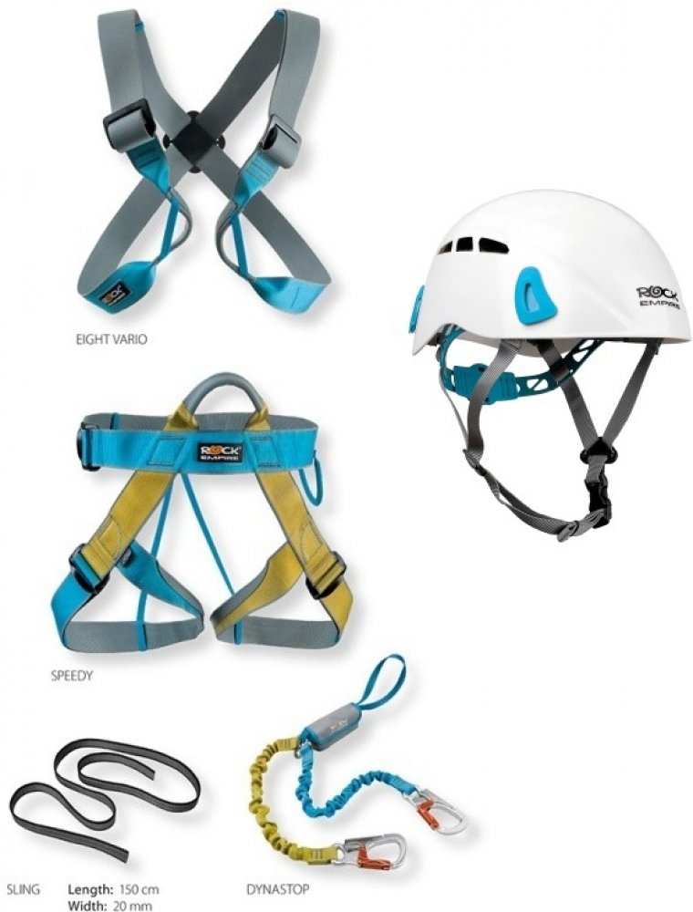 ROCK EMPIRE Ferrata Safety Set - Zvýhodněný ferratový set od firmy Rock Empire, který se těší větší a větší oblibě. Set obsahuje prsák Eight Vario, nepolstrovaný úvazek Speedy, tlumič pádů Dynastop a smyce 20 mm x 150 cm.