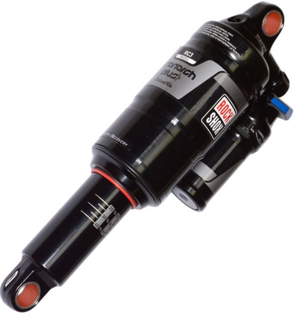 "Vzduchový tlumič Rock Shox Monarch Plus RC3 s přídavnou expanzní nádobkou Plus a zvětšenou Debon Air vzduchovou komorou.