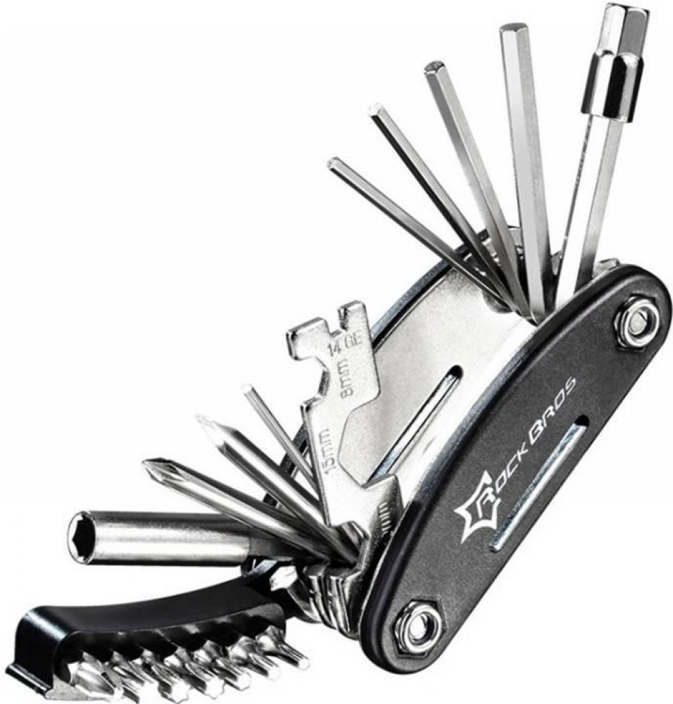 Už se nemusíte bát, že vám nečekaná porucha zkazí výlet na kole a vy budete muset jít domů pěšky. Multifunkční kapesní nůž Rockbros vám pomůže opravit většinu drobných poruch! Tento praktický multitool nabízí až 16 nástrojů v jednom - včetně imbusových klíčů, sady kapesních klíčů, šroubováků a nástrčných hlavic. Navíc je vyroben z odolné uhlíkové oceli a má přenosný design.