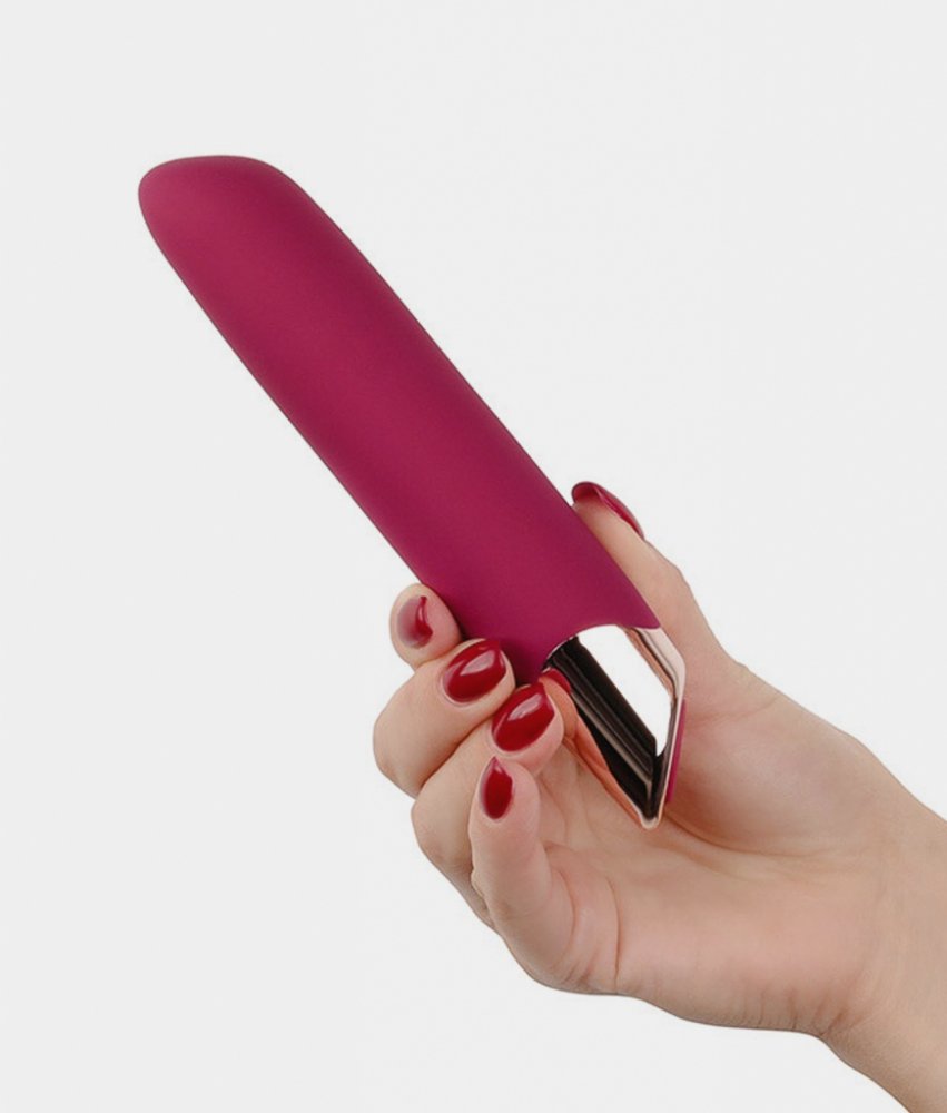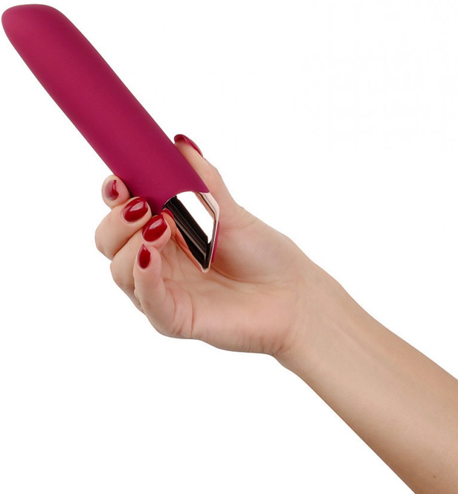Elegantný, bordový vibrátor Chaiamo s vysokým výkonom. Je plne vodotesný, má zabudovanú batériu a napája sa pomocou USB. Až 3 hodiny chodu.