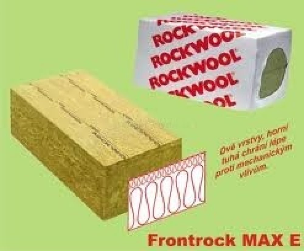 Rockwool Frontrock MAX E je tuhá deska z kamenné vlny s integrovanou dvouvrstvou charakteristikou, pojená organickou pryskyřicí, v celém objemu hydrofobizovaná. Horní velmi tuhá vrstva zabezpečuje vysokou odolnost proti mechanickému namáhání.