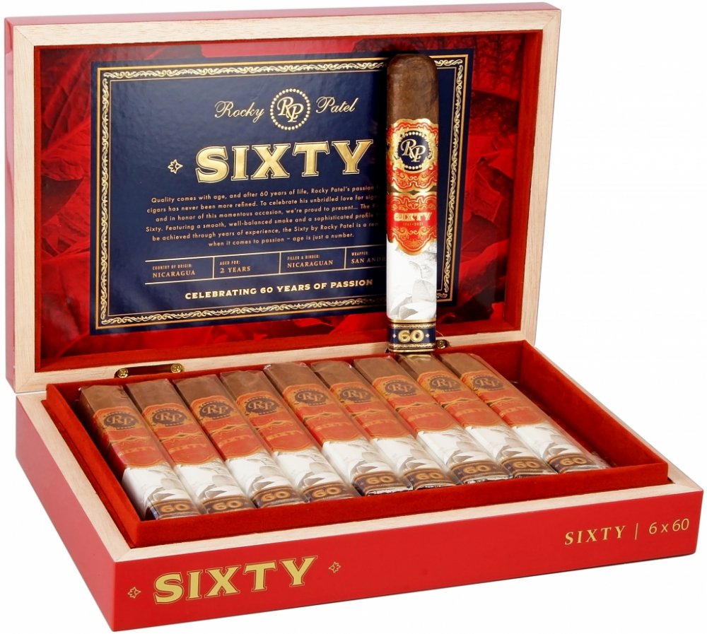 Rocky Patel Sixty je zemitý doutník plné tabákové chuti s tóny hořké čokolády, kávy a kakaa.Použitý tabák je stařený 2 roky ve fabrice Rocky Patel v Nikaragui.