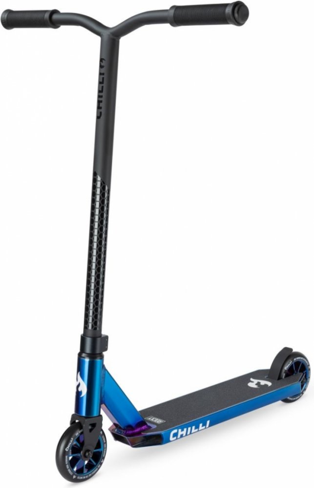 Chilli Rocky blue neochrome je skvělá volba pro všechny, kteří chtějí začít s jízdou na freestyle koloběžce. Chilli Rocky spojuje odolnost, výkon a styl a proto je ideální pro první triky i každodenní zábavu ve skateparku. Začínající jezdec nebo mírně pokročilý jezdec bude jen těžko hledat v této cenové kategorii lepší a stylovější koloběžku než je právě koloběžka Chilli Rocky blue neochrome. Díky...