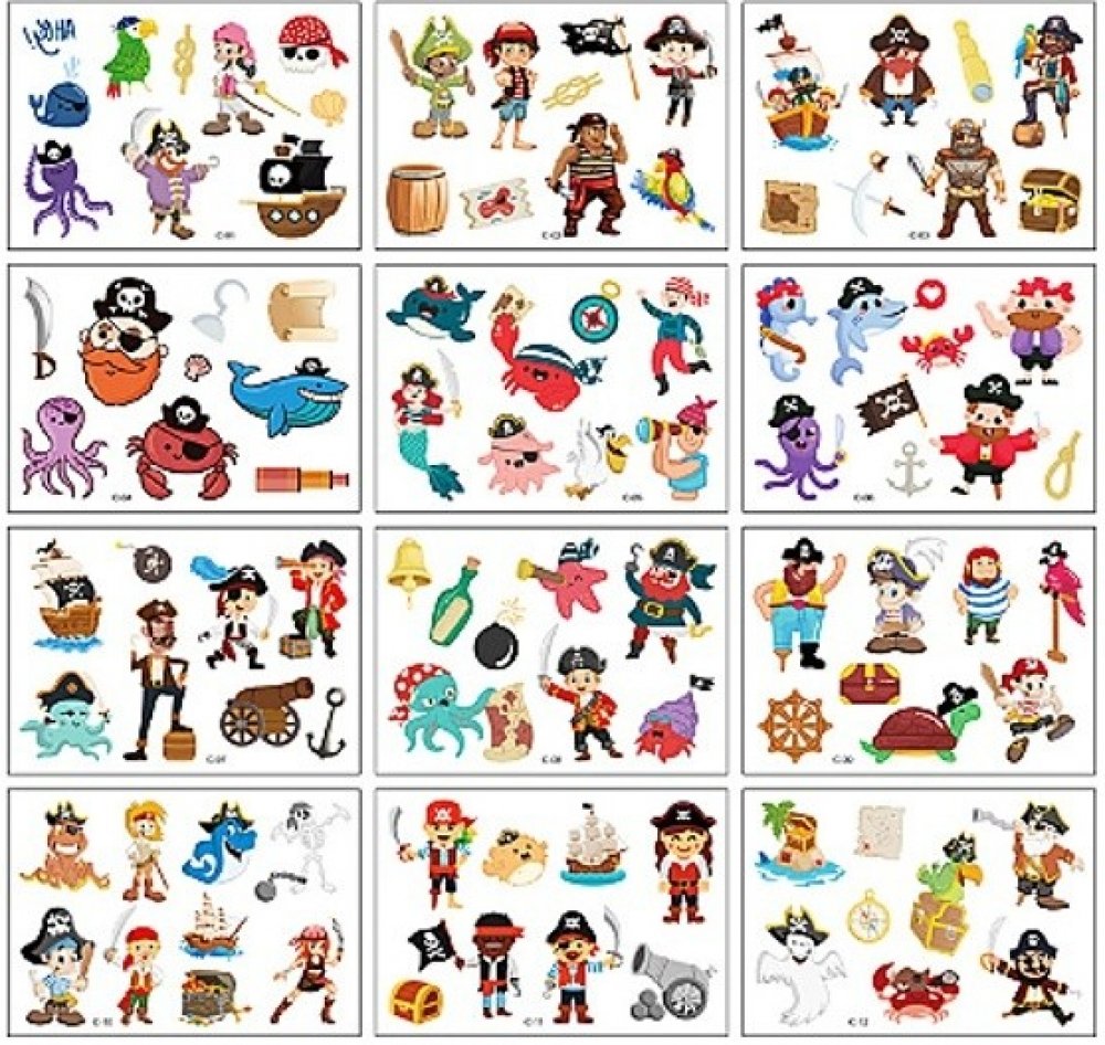 Dočasné tetování - tetovací obtisky ze série Piráti nabízí 12 různých variant. Tetování odstraníte mýdlem nebo dětským olejíčkem.