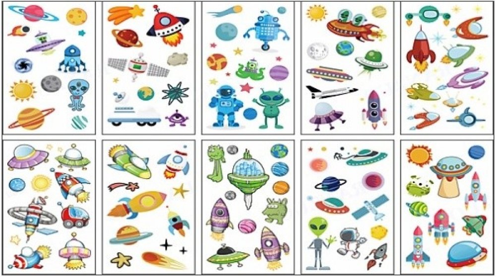 Dočasné tetování - tetovací obtisky ze série Vesmírný svět nabízí 10 různých variant. Tetování odstraníte mýdlem nebo dětským olejíčkem.