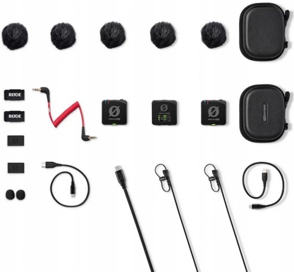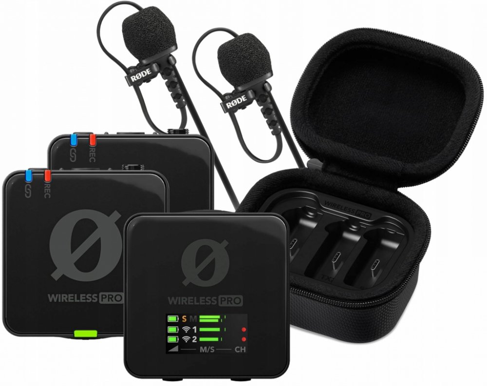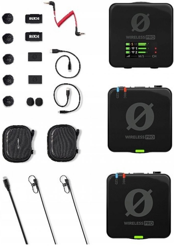 Wireless PRO sa dodáva so všetkým, čo potrebujete k bezdrôtovému nahrávaniu zvuku vo vysielacej kvalite: dva vysielače, jeden prijímač, inteligentné nabíjacie puzdro, dvojica lavalier mikrofónov, protiveternej ochrany, magnetické klipy a všetky potrebné káble na pripojenie k zariadeniam.