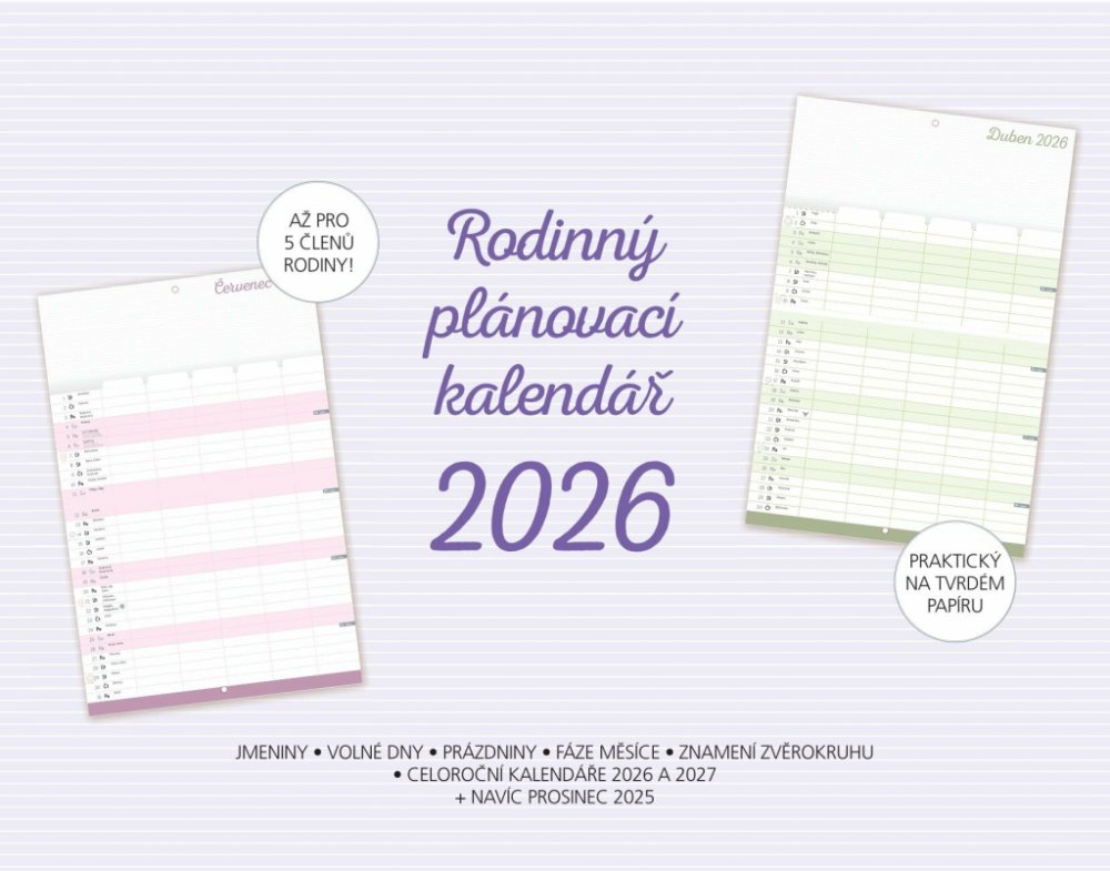 Rodinný plánovací kalendář 2026 - prázdný Rodinný plánovací kalendář 2026 – prázdný je ideální volbou pro každodenní organizaci domácnosti. Nabízí velký prostor pro poznámky až pro 5 členů rodiny, přehledné rozvržení a praktické informace na každý měsíc. Díky neutrálnímu designu se hodí do každé domácnosti i kanceláře.Každý měsíc je zpracován na pevný papír o rozměru 440 × 285 mm, s velkými políčk...
