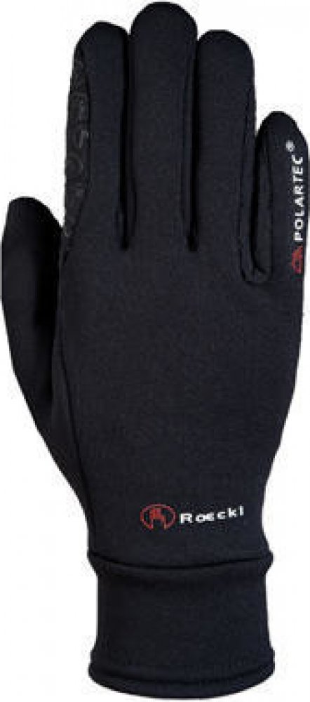 Zimní rukavice Roeckl Warwick. Vyrobené z extra hřejivého PolarTec Power Stretch materiálu s fleece zateplením 312g/m². Velmi elastické, dobře se přizpůsobí tvaru ruky. Silikonový protiskluzový potisk ve tvaru loga Roeckl po celé dlani a mezi maličkem a prsteníčkem - brání klouzání otěží. Barva: černá.