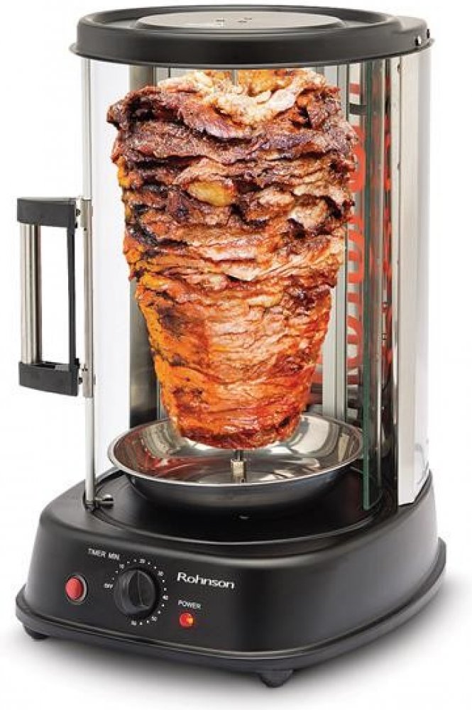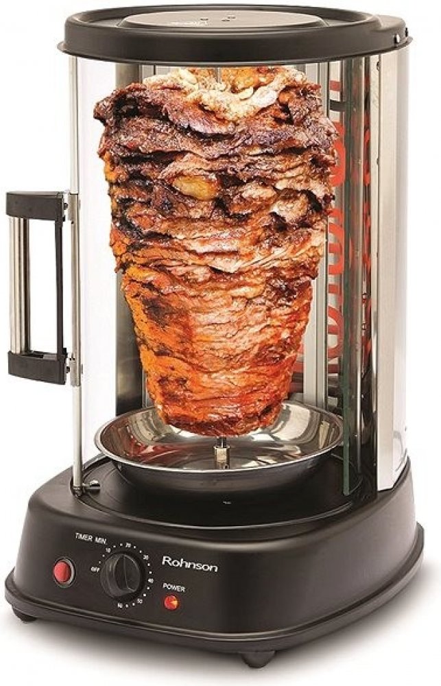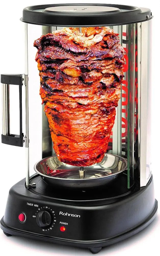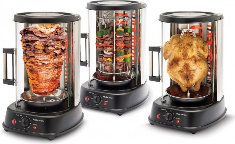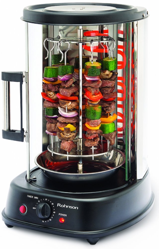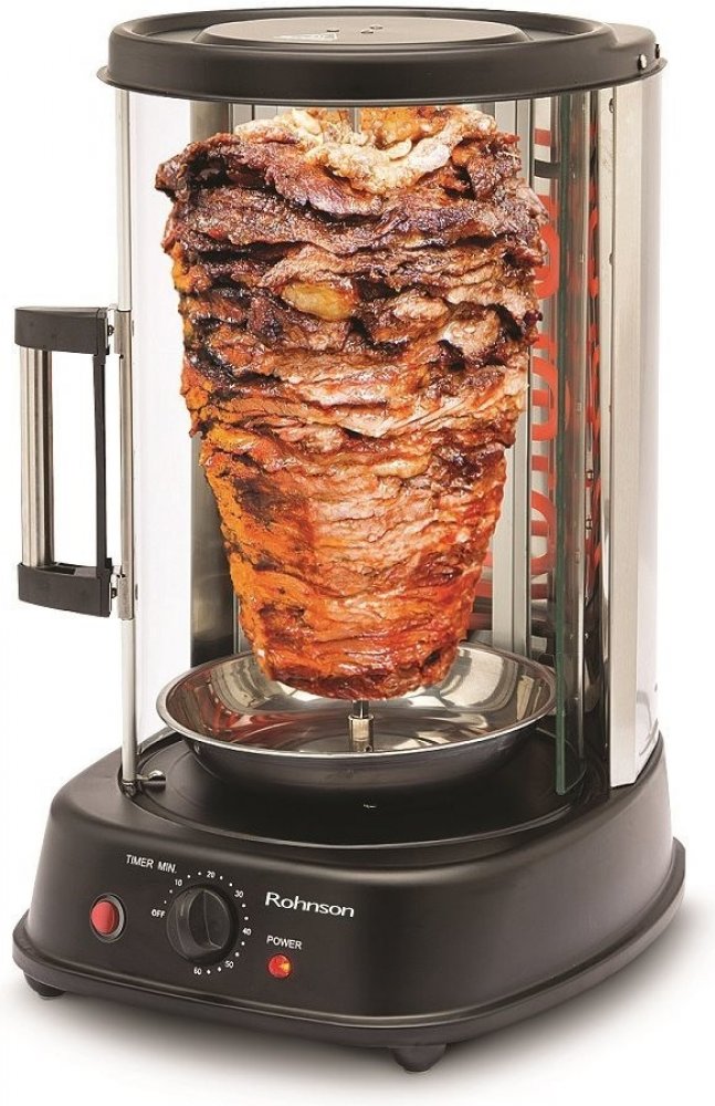 Ideální na kuře, gyros, špízy, ryby i zeleninu ⏲️ Časovač s automatickým vypnutím pro pohodlné vaření ️ Regulace výkonu topného tělesa pro přesnou kontrolu Patentovaný design pro rychlé a efektivní pečení Odkapávací miska na přebytečný tuk pro zdravější přípravu Bohaté příslušenství s rožněm, miskou a špízy
