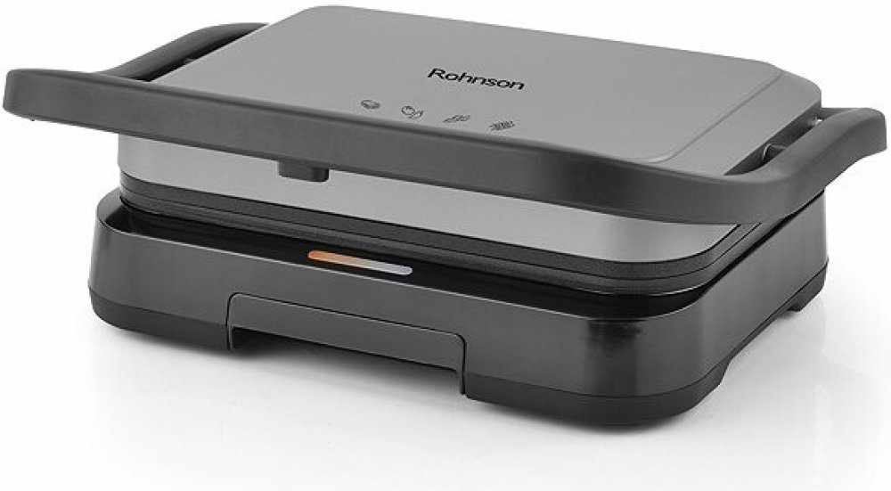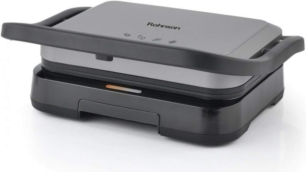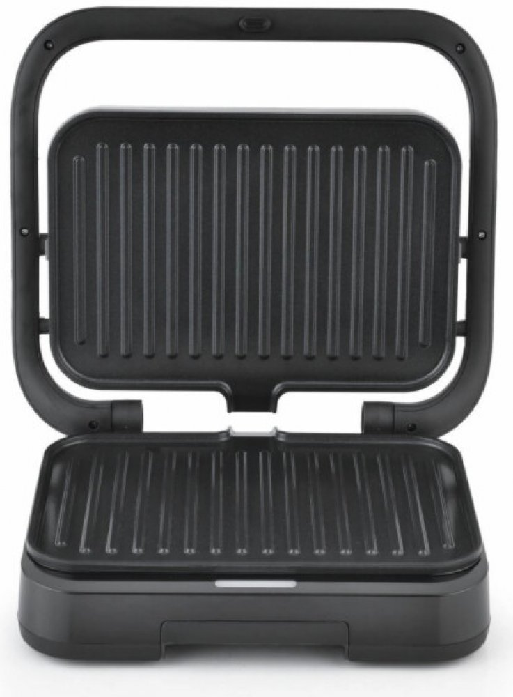 Kontaktní gril, příkon 1200 W, velké pečicí pláty 17,5 x 25,7 cm z litého hliníku, nepřilnavý povrch plátů, možnost grilování v otevřené pozici 180°, odkapávací miska, protiskluzové nožičky, černá