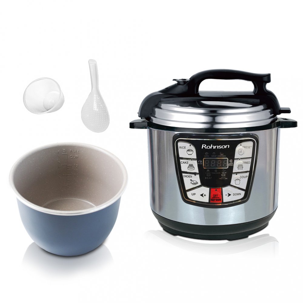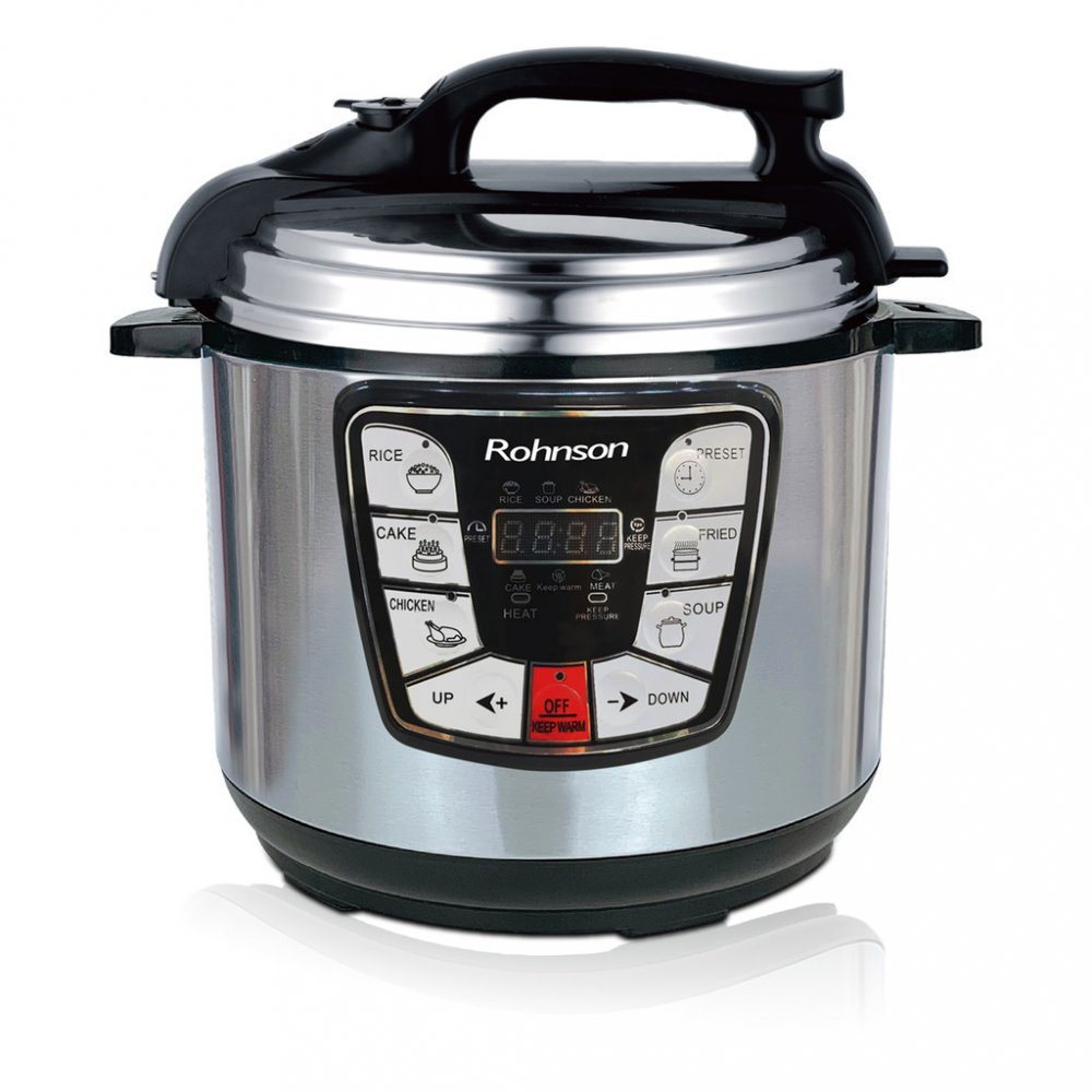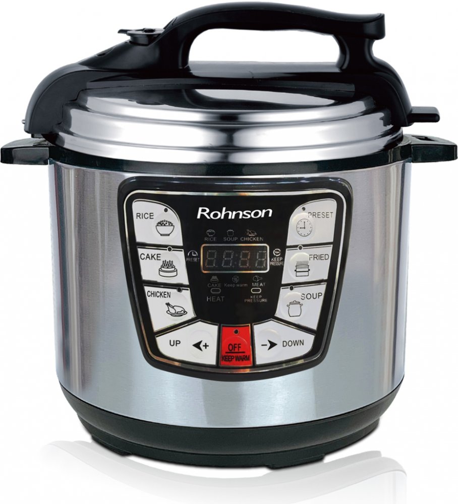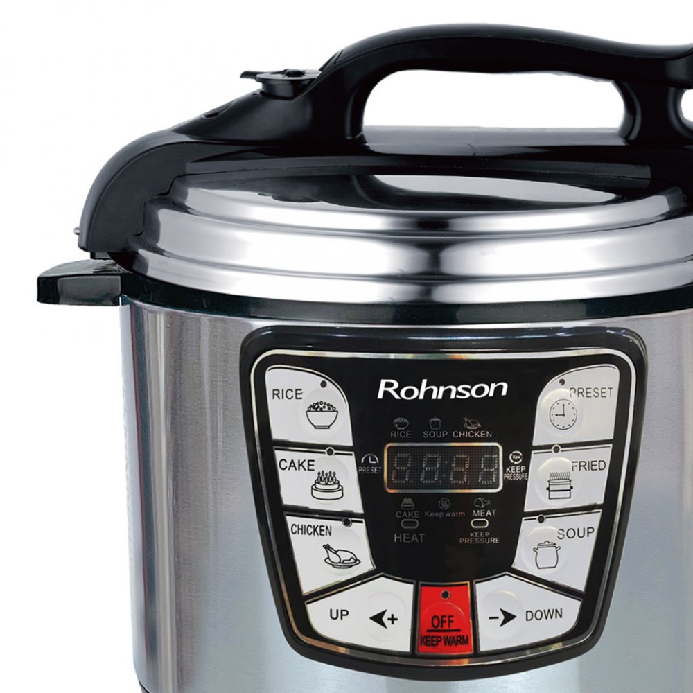 Vyburcujte v sobě kuchařského mistra s pomocí elektrického tlakového hrnce Rohnson. S pomocí tlakového hrnce (papiňáku) o objemu 6 l snadno připravíte jídlo až pro 6 členů rodiny. S pomocí praktického časovače jednoduše zvládnete nastavit čas ohřevu. Nádobu elektrického tlakového hrnce můžete mýt v myčce na nádobí. Vnitřní nádoba se dá vytáhnout. Díky displeji budete mít dokonalý přehled o tlaku uvnitř elektrického hrnce či času vaření. Podstatné funkce elektrického tlakového hrnce Rohnson Příkon elektrického tlakového hrnce Rohnson činí 1000 W Objem papiňáku: 6 l Časovač pro bezproblémové nastavení doby vaření Nádobu lze umýt v myččce Nádobu lze vydělat Dokonalý přehled o délce vaření či tlaku díky displeji Výrobková řada: rohnson