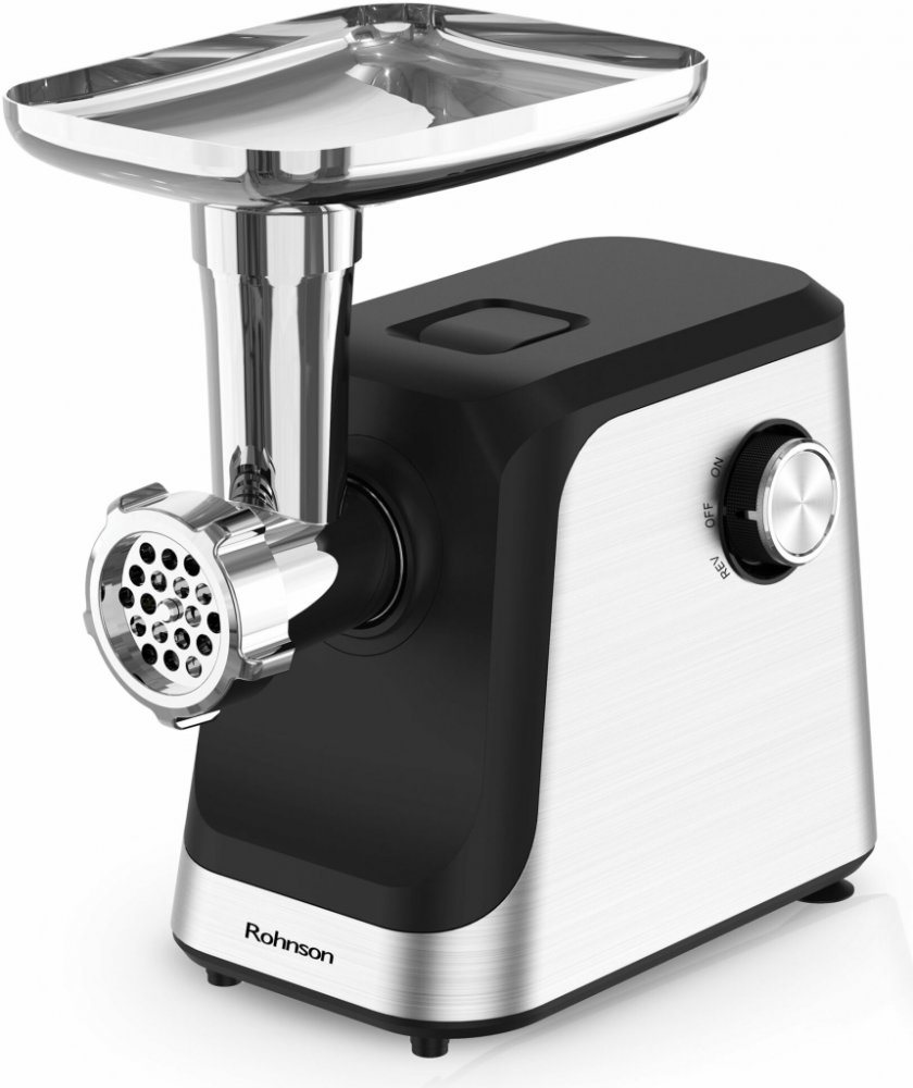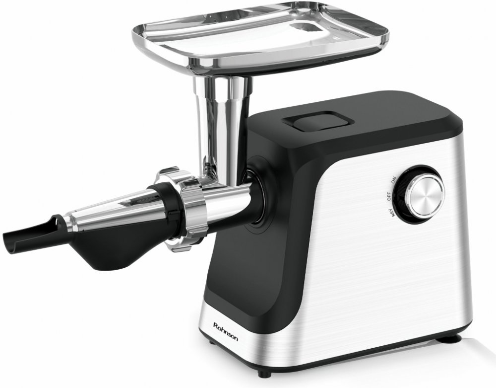 Kvalitní a výkonný motor, nástavec na výrobu rajčatového protlaku a uzenin, 1 rychlost, zpětný chod, nerezové nože, 2 kovové mlecí disky.