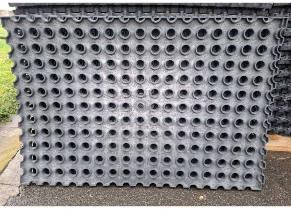 Materiál: recyklovaný granulát z PVCVlastnosti:Protiskluzový povrch a hrany opatřeny zámky zabraňují posunu jednotlivých rohoží, odolávají močovině a také velkému mechanickému opotřebení. Při došlapu jsou pružné, tudíž mají příznivý vliv na klouby koní. Díky tomu že tepelně izolují, při ležení na této rohoži nedojde k prochladnutí zvířete. Jejich odolnost vůči olejům a některým kyselinám je umožňuje použít i do dílen a garáží.Při poškození rohože, je možné nahradit pouze poškozený kus a to bez rozebrání celé podlahy.Gumy se skládají nopkami nahoru!Podloží:Pokládají se na předem zpevněný a dobře zhutnělý povrch nebo na poškozený beton. Může být použita i kamenná drť.Využití:Tyto rohože jsou ideální zejména pro ustájení koní, hospodářských zvířat a výběhy psů. Je ale možné je použít také například v dílnách, průmyslových halách nebo třeba jako podlahy v garážích.Rozměry: 115cm x 75cm (+3,5cm zámek) x 4cmPočet kusů na paletě: 45 ks
