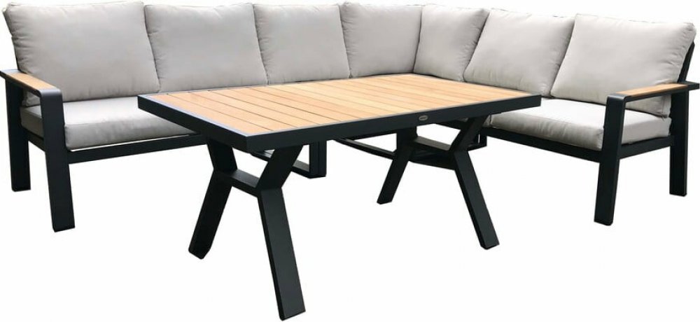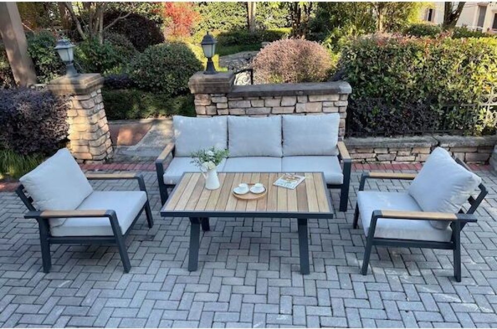 Zahradní set ROTTERDAM je vyroben z hliníkové konstrukce, područky a deska stolu jsou z teaku. Díky použitým materiálům a modernímu vzhledu sestavu lze využít v interiéru i v exteriéru. Součástí jsou pohodlné podušky z polyesteru s molitanovou výplní (10 cm), které jsou odolné UV záření. Všechny podušky jsou vybaveny zipy, díky kterým můžete polyesterový potah jednoduše sundat.