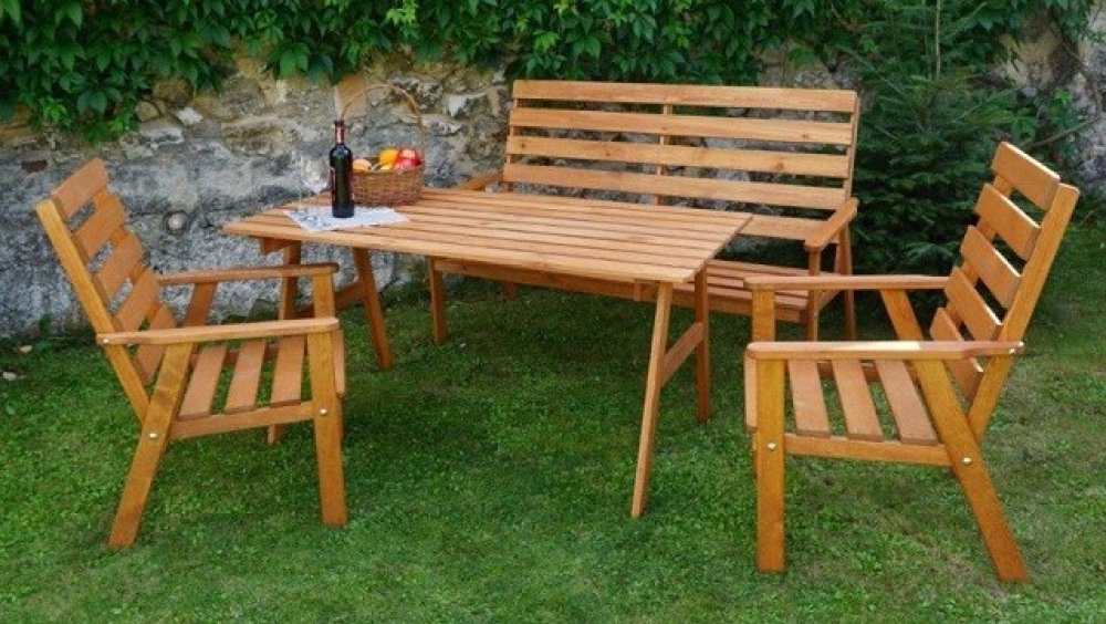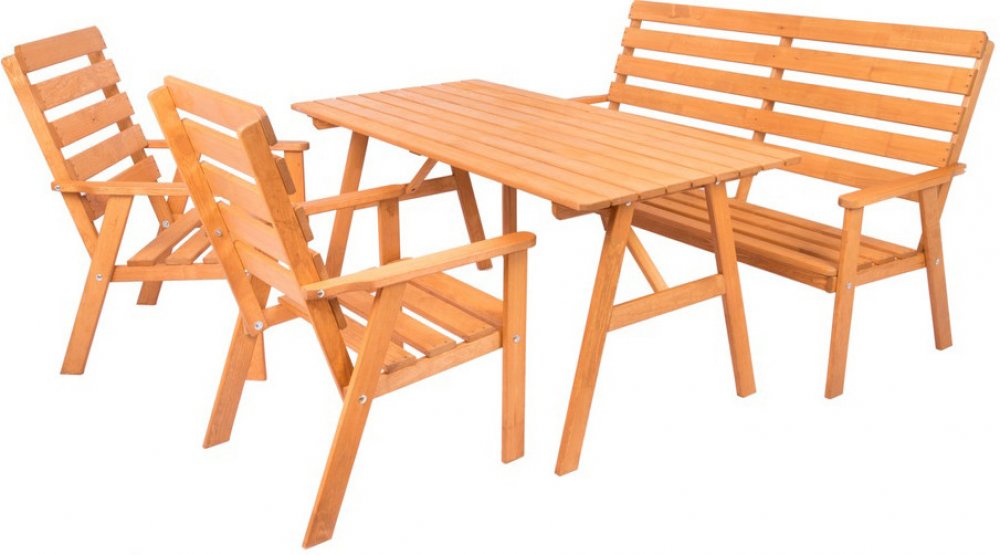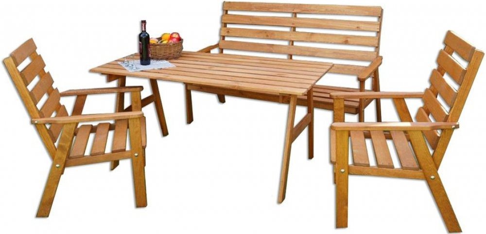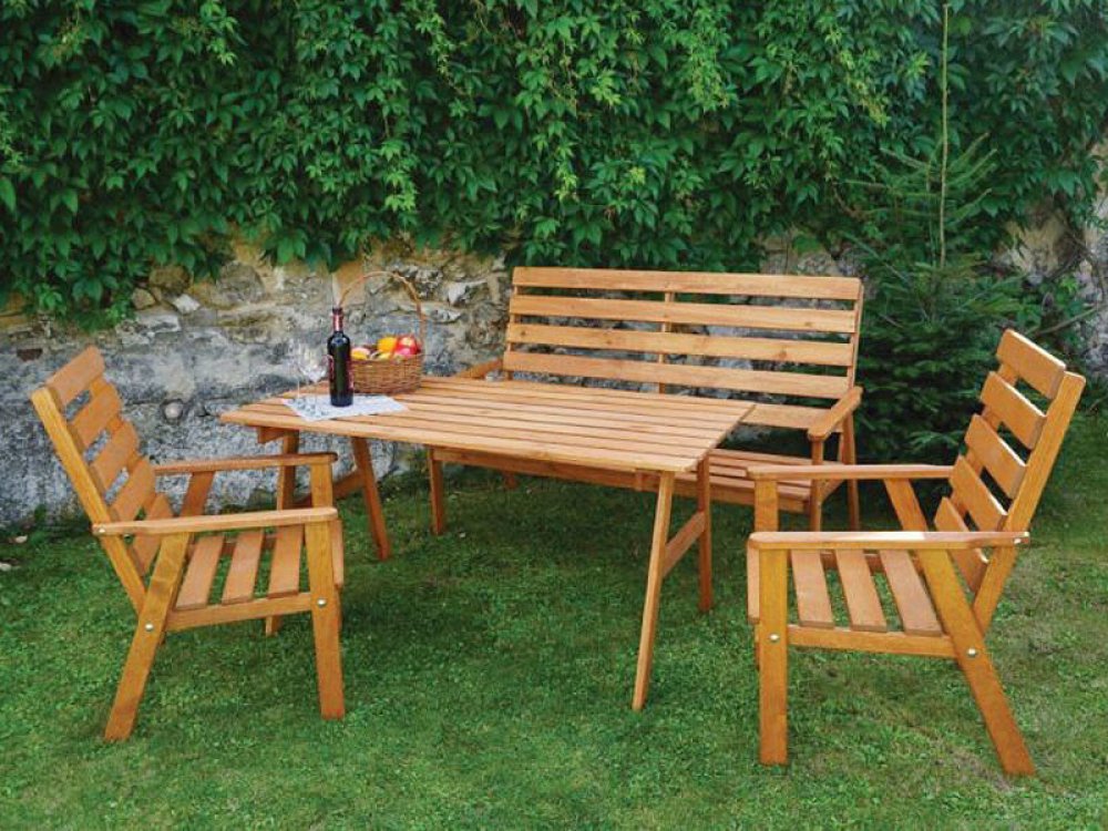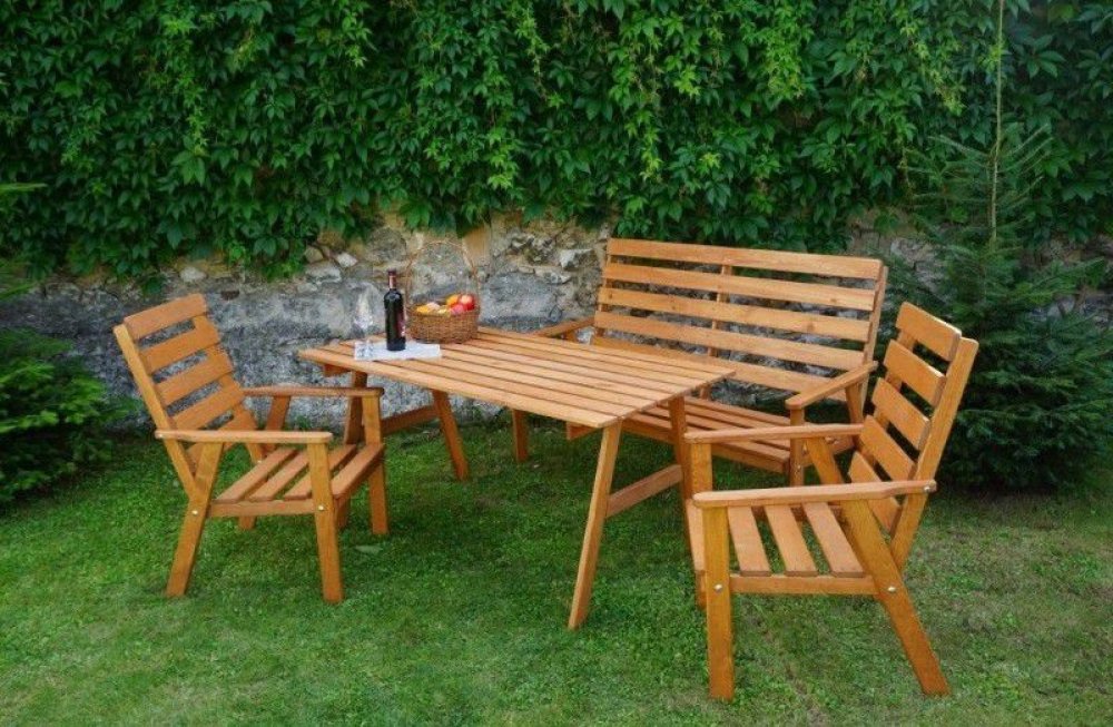 Zahradní set z borovicového dřeva je ideálním řešením pro ty, kteří hledají kompletní posezení na zahradu či terasu. Set se skládá z lavice, dvou křesel a stolu. Certifikát FSC zaručuje, že použité dřevo pochází ze šetrně obhospodařovaných lesů, ve kterých jsou dodržovány přísné ekologické a sociální požadavky.