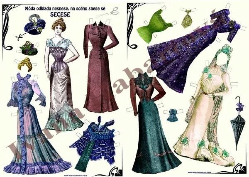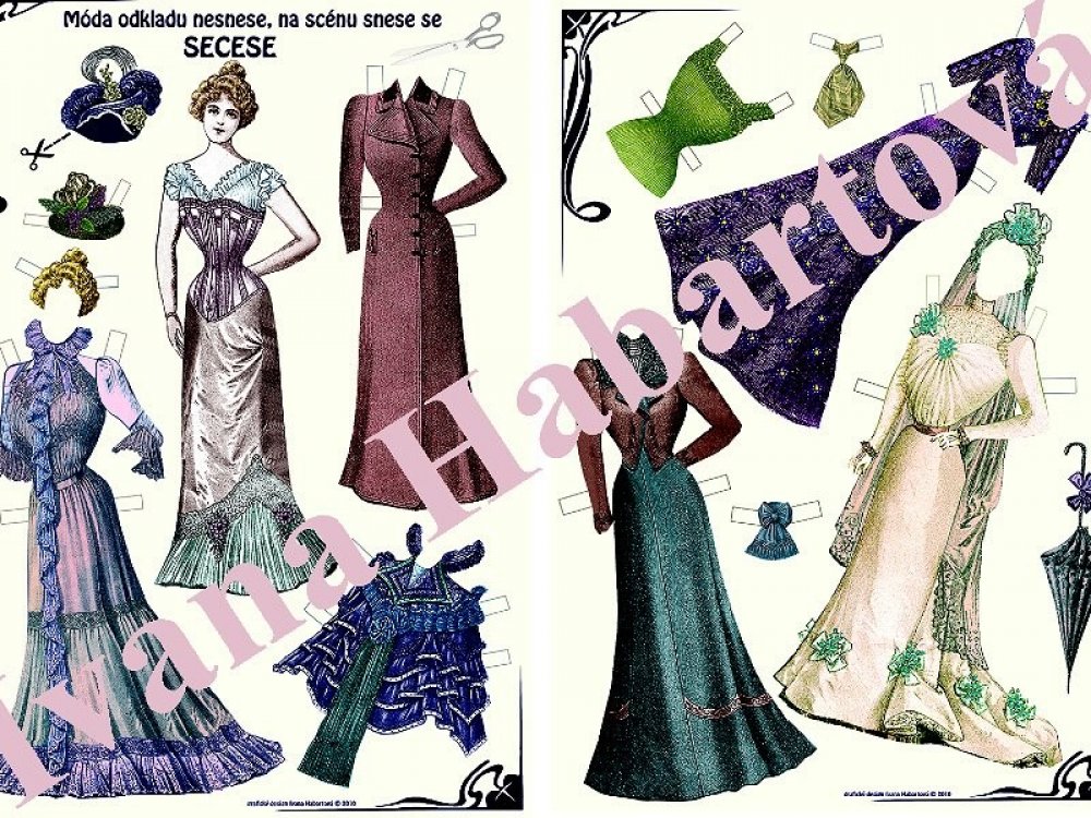 Pod heslem "Móda odkladu nesnese, na scénu snese se secese" vám nabízíme papírovou secesní panenku na vystřihování a oblékání. Panenka si může vzít patery různé šaty, živůtek, halenku, šátek na krk, dvě různé pokrývky hlavy, deštník a dokonce i zlatavou paruku!