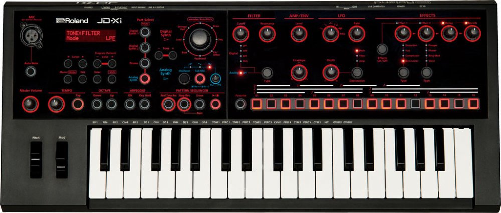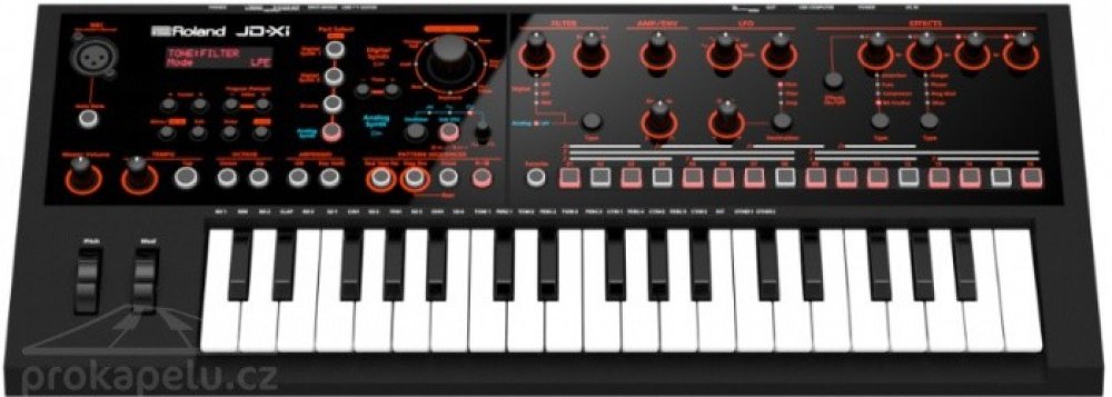 Výkonný a kompaktní syntetizér s vestavěným pattern sekvencerem a vokálními efektyMalý, výkonný a cenově dostupný. Skutečný analogový engine, oblíbené zvuky Roland SuperNATURAL Synth a mnoho dalších kreativních nástrojů, to je Roland JD-Xi.Kompaktní nástroj s 37 mini klávesami nabízí hutné analogové basy a čisté tóny s rozsáhlými možnostmi ladění. K tomu navíc polyfonní PCM zvuky jako například žestě, struny a další. Vytvořte během okamžiku působivé smyčky s pattern sekvencerem a vestavěnými bicími, prozkoumejte expresivní vokální textury, Vocoder a AutoPitch. Malá velikost a obrovská všestrannost, JD-Xi je o pořádném zvuku a velké zábavě.• Interaktivní crossover syntetizátor s analogovými a digitálními zvukovými procesory• Sekce analogového syntetizéru poskytuje známé a typické zvuky• Dvě sekce digitálního syntetizéru se SuperNATURAL synth zvuky a 128 hlasou polyfonií• Čtyř pásmový pattern sequencer a velmi kvalitní rytmy• Přiložený mikrofon pro použití s funkcemi Vocoder a AutoPitch• Přizpůsobení zvuku pomocí čtyř současně použitelných efektů (Efekt 1/2, Delay, Reverb)• USB konektor pro audio/MIDI připojení k vašemu hudebnímu softwaru• Obsahuje velký výběr okamžitě připravených zvuků a paternů• Další zvuky a paterny ke stažení na webu Roland AxialAnalogový i Digitální Syntetizér v jednom zařízeníDíky svému unikátnímu crossover zvukovému enginu, poskytuje JD-Xi to nejlepší z obou světů příjemnou analogovou klasiku a k tomu všestranný a moderní digitální zvuk. Nový monofonní analogový syntezátor má vlnové průběhy SAW, TRIANGLE a SQUARE, plus modulaci šířky pulzu (PWM) a analogový filtr; k tomu nezávislý sub-oscilátor pro největší sílu v nízkých pásmech. Dvě digitální sekce poskytují 128 hlasou polyfonii a velkou paletu kvalitních zvuků SuperNATURAL (syntezátory, pady, smyčcové nástroje, elektrické piana, zvukové efekty a další)."Gooseneck" mikrofon pro vokodér, AutoPitch a další vokální efektyBalení JD-Xi obsahuje praktický a kvalitní mikrofon s husím krkem, který přináší do hry další zábavu. S využitím