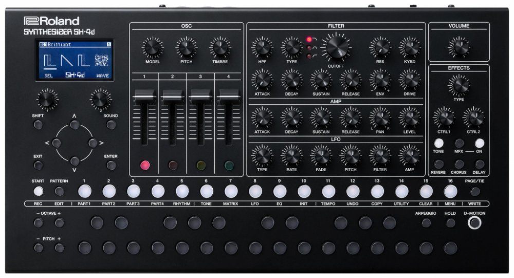 Kompaktní stolní syntezátor s 11 OSC modely, profesionálními nástroji pro navrhování zvuku, praktickým pracovním postupem, multitimbrálním sekvencerem vzorů, rozsáhlými efekty a dalšími funkcemi.Seznamte se se syntetizátorem SH-4d, stolním syntetizátorem s praktickým pracovním postupem a nástroji pro hloubkovou syntézu pro navrhování zvuků včerejška, dneška a zítřka. Vytvářejte spontánní hudební momenty s 11 OSC modely, multitimbrálním pattern sekvencerem, rozsáhlými efekty a množstvím polyfonie. A díky nabitému panelu, dynamickým ovládacím prvkům, nahrávání pohybu a dalším funkcím můžete vytvářet vyvíjející se zvuky a kompozice tak rychle, jak přicházejí nápady. SH-4d je rovněž vhodný do studia, na pódium i na cesty, je to neuvěřitelně všestranný syntezátor, který uvolňuje inspiraci od okamžiku zapnutí.Jedenáct modelů OSC pokrývá vše od vintage analogových a klasických PCM tónů až po špičkové digitální texturyModely OSC zahrnují nový nativní engine SH-4d, Wavetable, Cross FM, JUNO-106, SH-101 a dalšíČtyři nezávislé syntezátorové části a specializovaná rytmická část s celkovou polyfonií až 60 hlasůRytmická část s volitelnými průběhy, výkonnými ovládacími prvky syntézy, možností vrstvení a dalšími funkcemi pro individuální zvukový design každého nástrojePlně naložený panel s přímým přístupem s 32 knoflíky, čtyřmi slidery a obrovským množstvím tlačítekPracovní postup na nejvyšší úrovni rozhraní překonfiguruje LCD displej a ovládací prvky panelu pro režim Model nebo Performance, aby se eliminovalo potápění v menu a tvůrčí zpomaleníVyhrazené sekce filtru, zesilovače a LFO s komplexním ovládánímPokročilá matice pro modulaci více přiřaditelných parametrůTlačítková klaviatura s rozsahem více než dvě oktávy pro samostatnou tvorbu hudbyMultitimbrální sekvencer se 128 vzory, nahráváním v reálném čase, dvěma režimy krokového vstupu a nahráváním pohybuPravděpodobnost a nastavení dílčích kroků na notu pro tóny a rytmické části v sekvencích patternůUnikátní funkce D-Motion a Visual Arpeggio pro vytváření efektů vystoupení fyzickým pohybem SH-4dRozsáhlé vestavěné zpracování zvuku s MFX pro každý tón plus globální MFX, reverb, chorus, delay a dalšíRozhraní USB-C audio/MIDI a 5tipinový vstup/výstup MIDIClock vstup pro synchronizaci s modulárními syntezátory a dalším vybavením RolandStereo 1/4palcové audio výstupy a konektor pro sluchátka3,5 mm stereo audio vstup pro mixování jiných syntezátorůRobustní přenosný design napájený bateriemi nebo USB-C