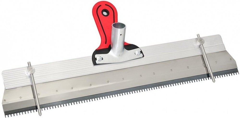 Stěrka pro nanášení lepidel a vyrovnávacích hmot na velké plochy v ergonomické vzpřímené poloze. Včetně jedné vložky R2 a dvou hrotů pro nastavení různých výšek. Dodávka s držákem násady (bez násady).