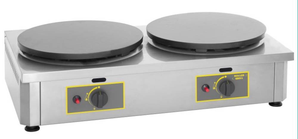 Plynová plotna na palačinky CDG 400 francouzského výrobce značky Roller Grill masivní litinová plotna s hladkým smaltovým povrchem o průměru 400 cm, 8 hvězdicových hořáků, regulační knoflík, termopojistka. Plotna na palačinky je vhodná do provozů s vysokým zatížením. Masivní a jednoduchá konstrukce se vyznačuje dlouhou životností zařízení a jednoduchou a rychlou údržbou. Dodáváno s tryskami na propan-butan a navíc s tryskami na zemní plyn. Volitelné příslušenství: „Palačinka KIT“ pro uložení špachtle, obracečky, nádobky se stěrkou a čistící houbička s kovovou rukojetí na rovnoměrné roztírání tuku vyhřívaná nádoba pro uchování teplé čokolády pro snadné roztírání