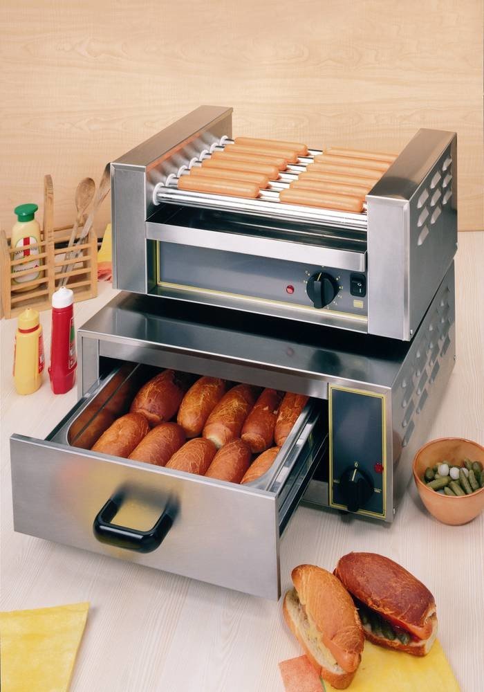 - Opéká párky bez použití tuku systémem chromovaných válečků o jednotlivém výkonu 125 W a udržuje je v servírovací teplotě.