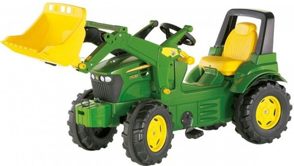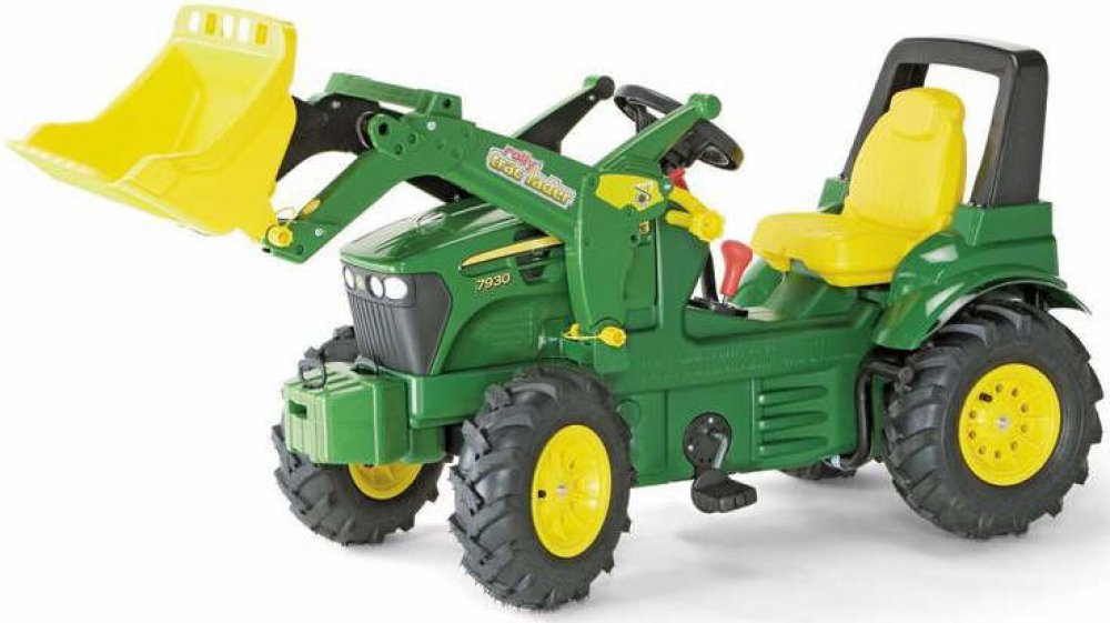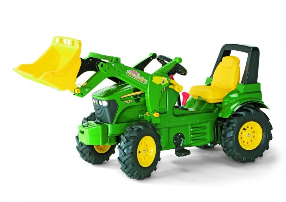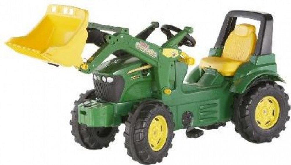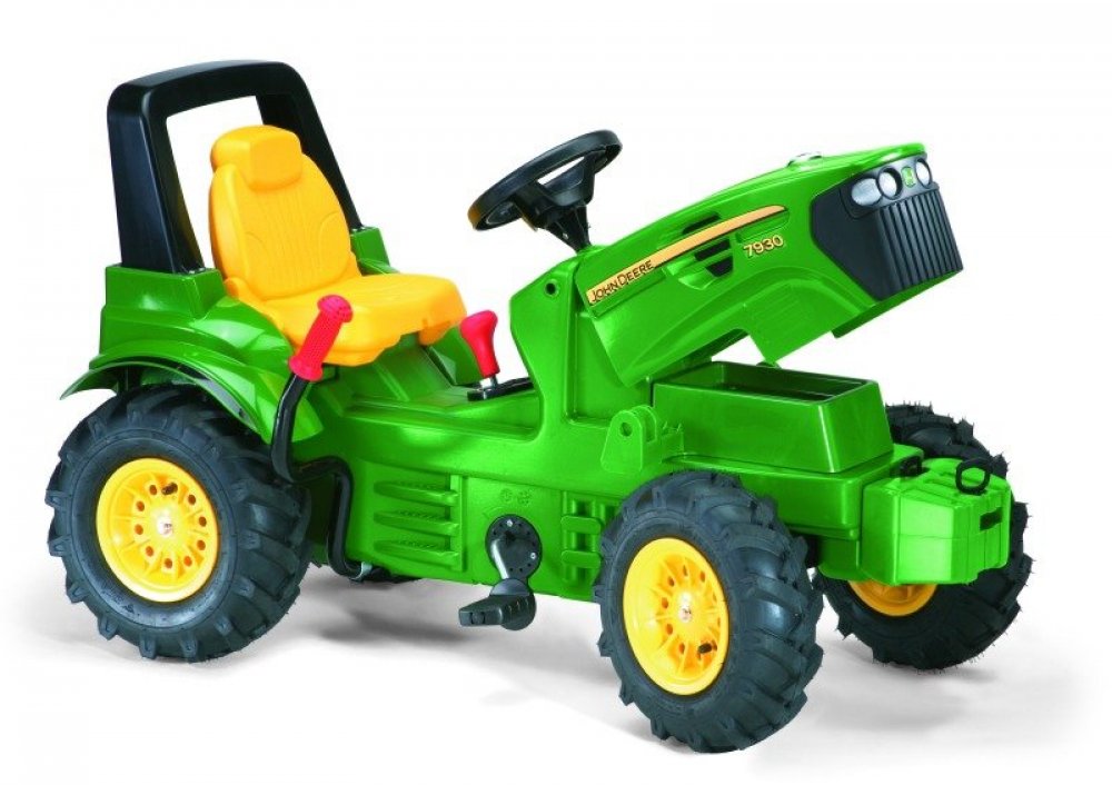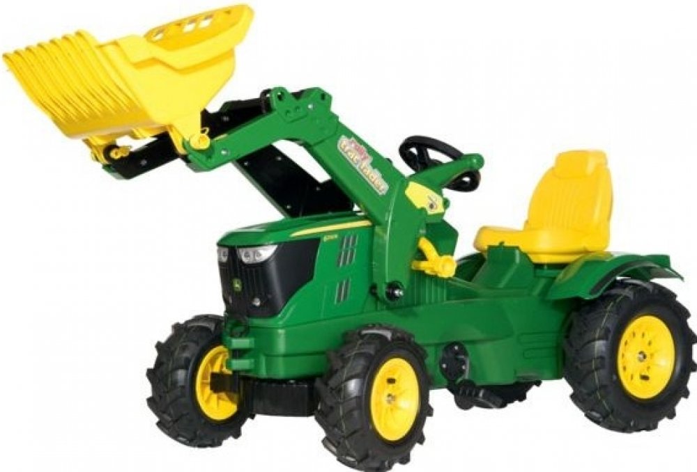 Krásný, šlapací traktor John Deere s předním nakaldačem, brzdou a nafukovacími koly potěší všechny malé zemědělce.