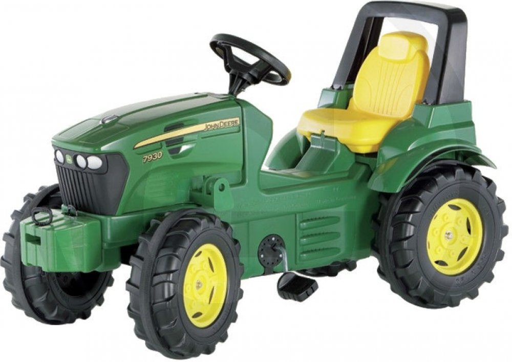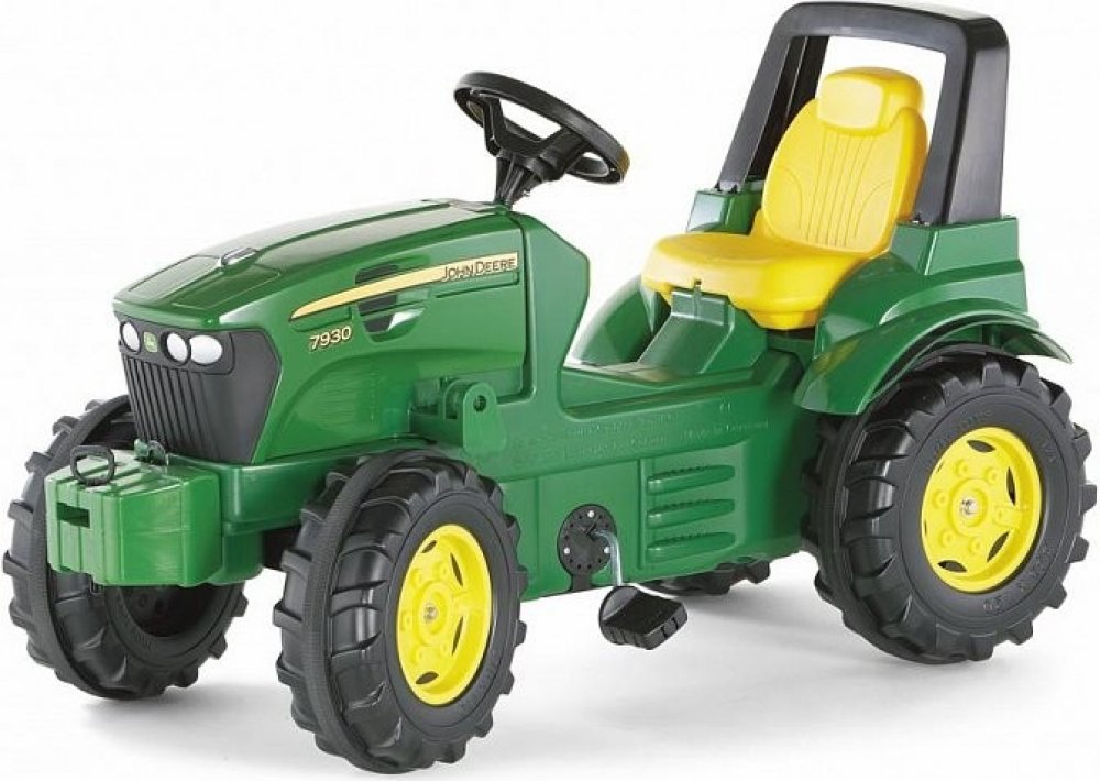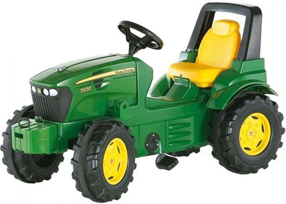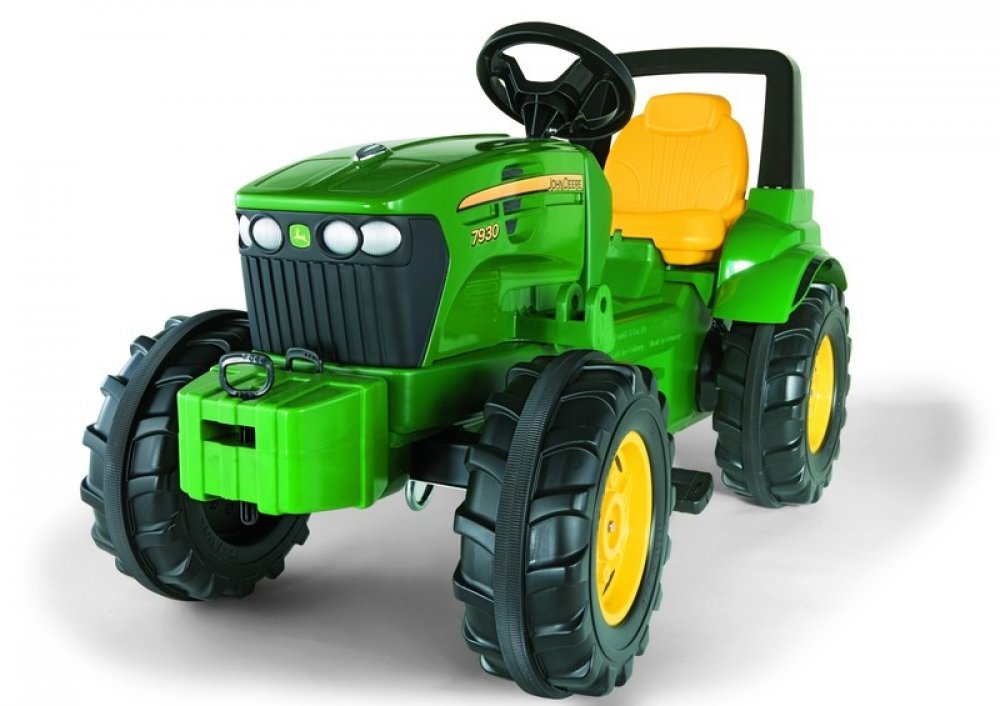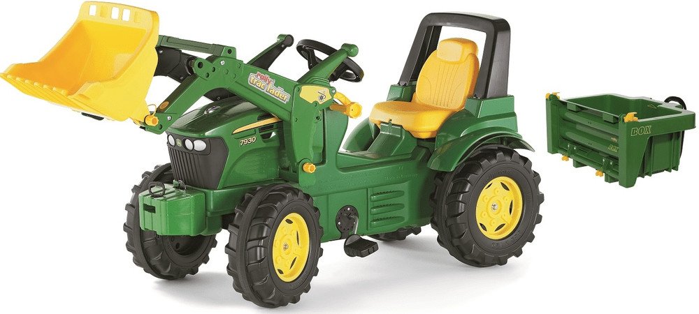 Krásný, šlapací traktor John Deere s předním nakaldačem, brzdou a nafukovacími koly potěší všechny malé zemědělce.